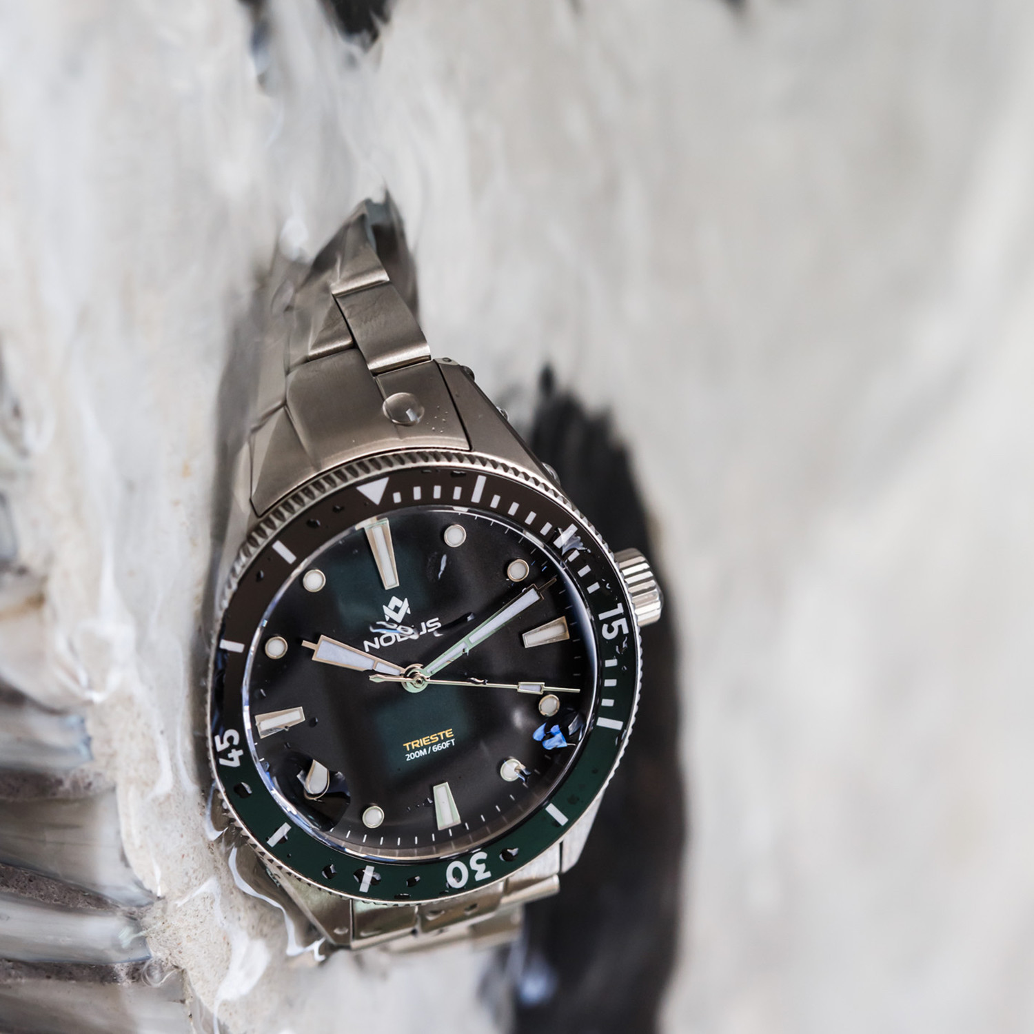 An elegant dive watch fit for any occasion, the Trieste Black Date Automatic features sleek hands and a symmetrically simplified design. The sapphire crystal protects from scratches and marks, while the dial, hands, and bezel insert are all filled with SuperLuminova to aid visibility in the dark.