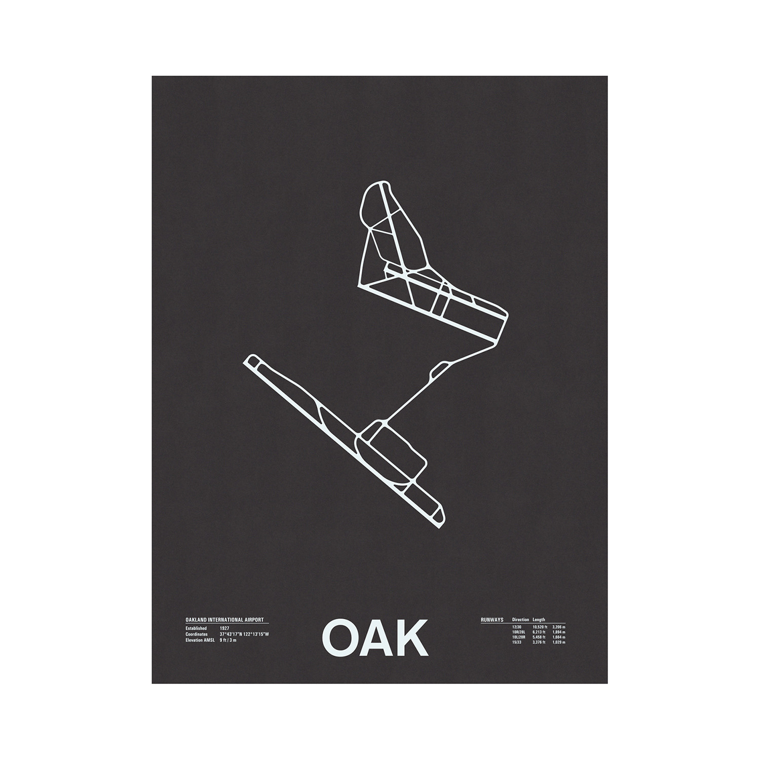 For the world traveller, aviation geek, map collector or design buff, the Oakland International Airport screenprint from the Runway Series of screenprints by Chicago-based design studio NOMO might be the perfect gift. Printed with white ink on dark gray paper from the French Paper Co., the sleek, minimalist poster features simple diagrammatic linework of the airport runways alongside its IATA code and airport statistics.