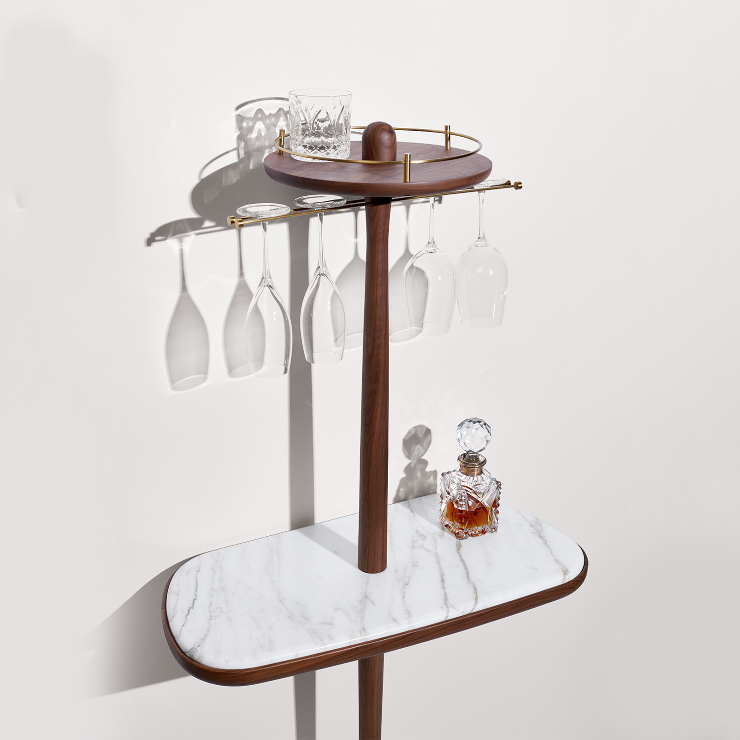 This Bar creates a sophisticated space to enjoy a drink in good company. The marble top and gold rods for hanging evoke classical bar cabinets.