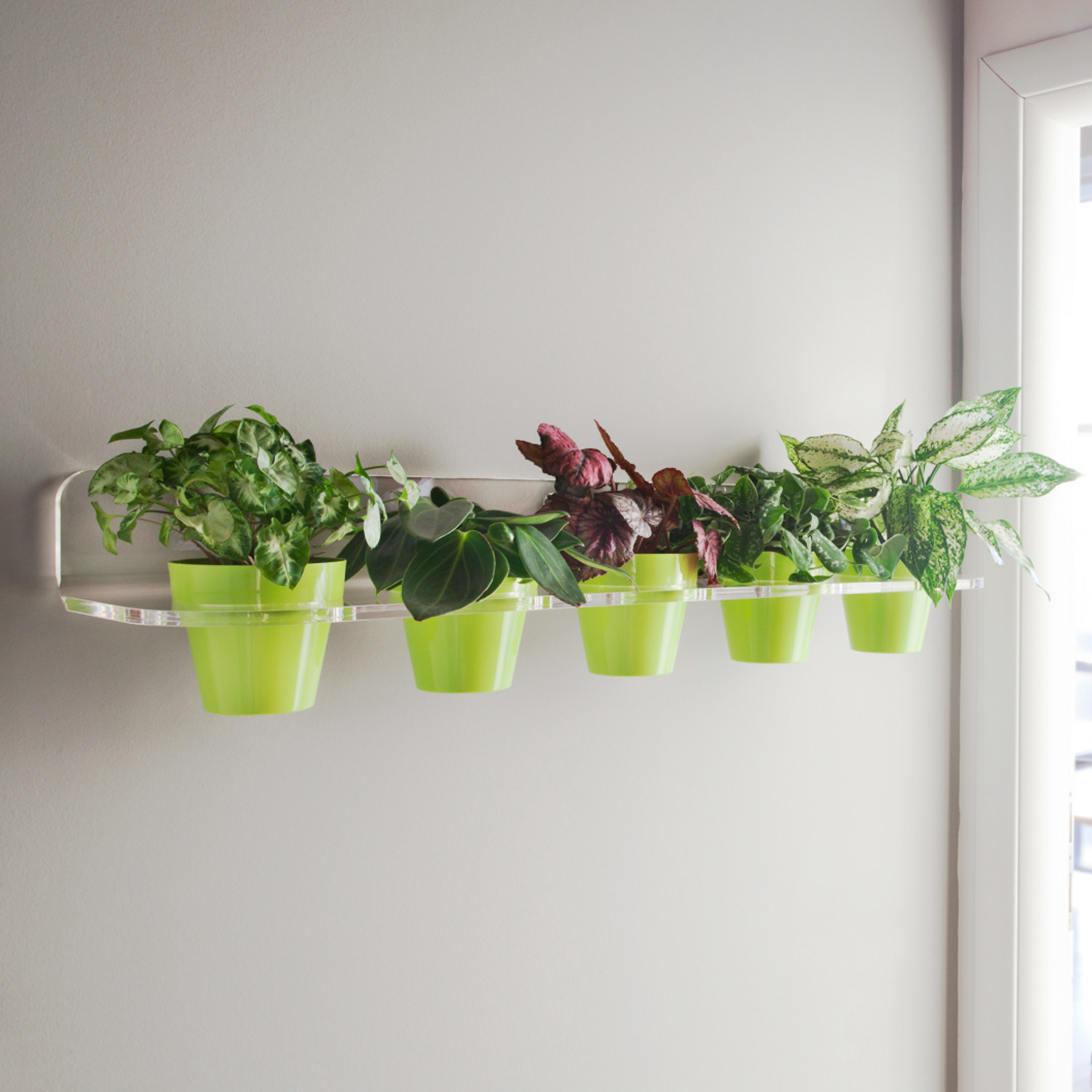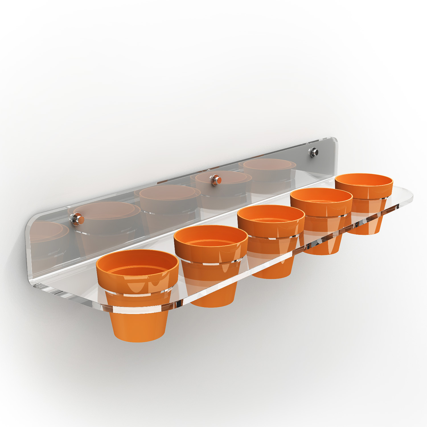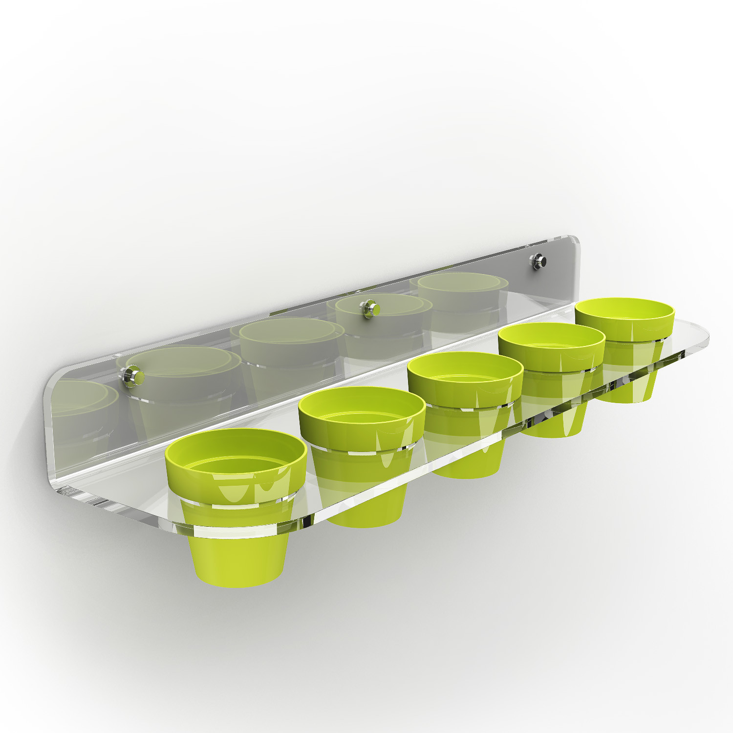 The G5 is a shelf for a modern gardener. The hand-bent and transparent methacrylate sheet contrasts beautifully with the silver hardware and 5 brightly-colored flower pots of your choice. A wonderful solution for home with ample wall space and not a lot of floorspace, you'll love the élan this planter brings.