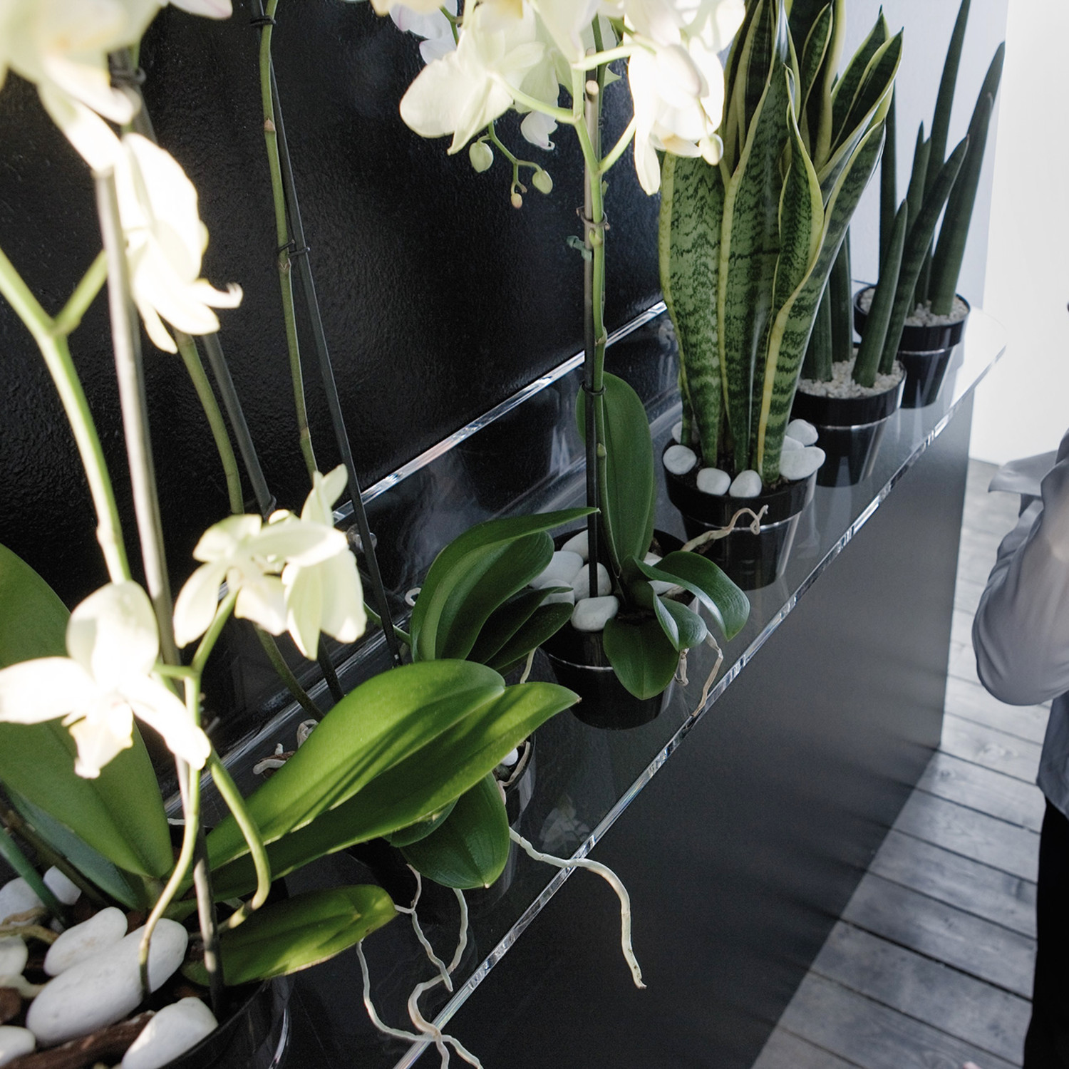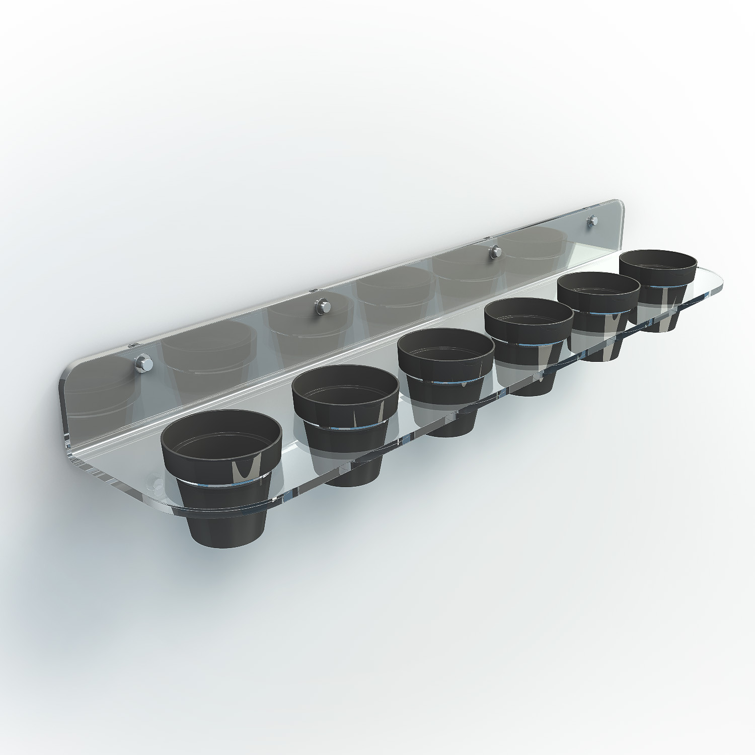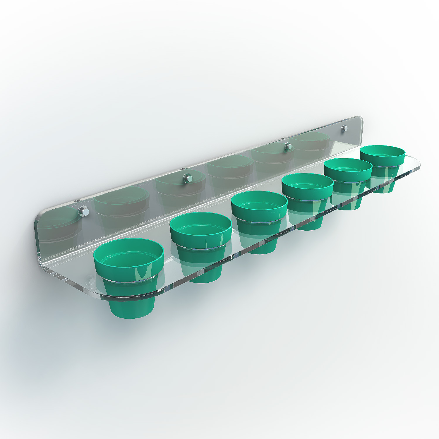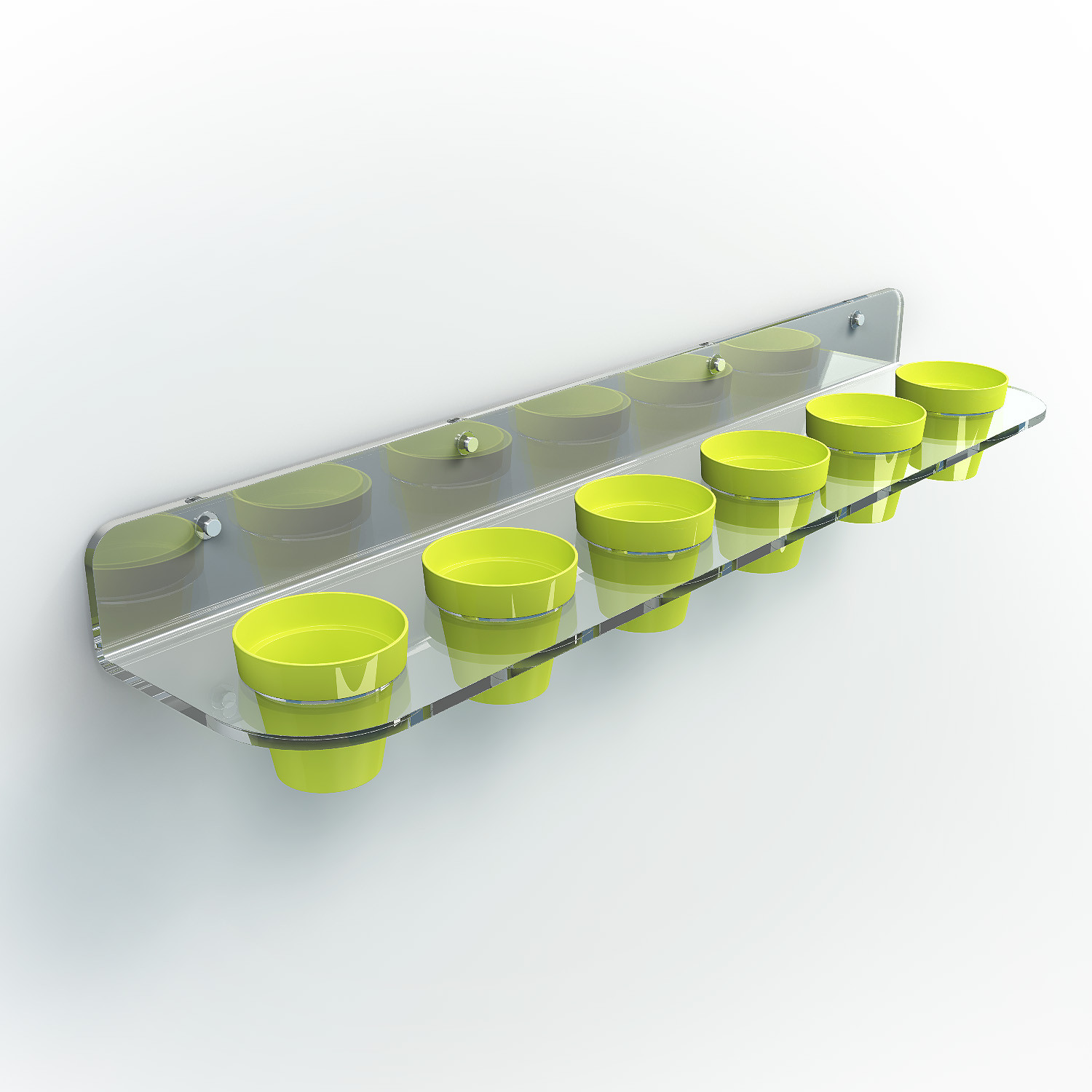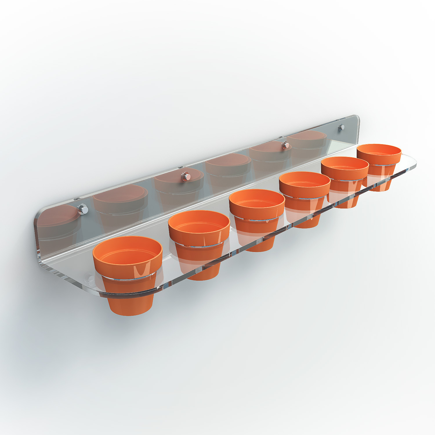 The G6 is a shelf for a modern gardener. The hand-bent and transparent methacrylate sheet contrasts beautifully with the silver hardware and 6 brightly-colored flower pots of your choice. A wonderful solution for home with ample wall space and not a lot of floorspace, you'll love the élan this planter brings.