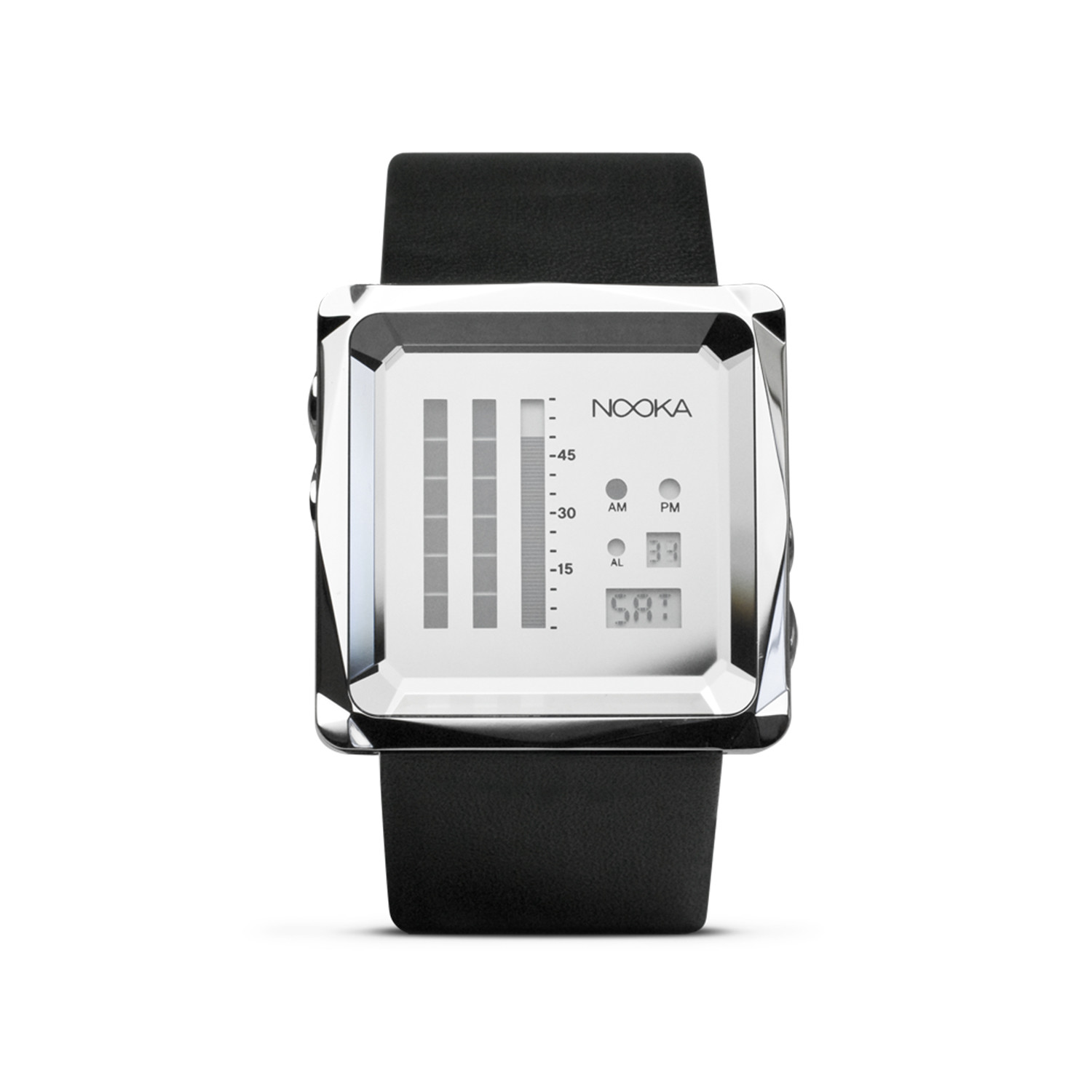 Inspired by the geometric shaping of gems, the Zem Zenv's unique casing gives it a larger feel and look, while displaying one of the four popular Nooka faces. Offering a multitude of combinations, the Zem is available in either a black leather band or a matching metal snake-like band.