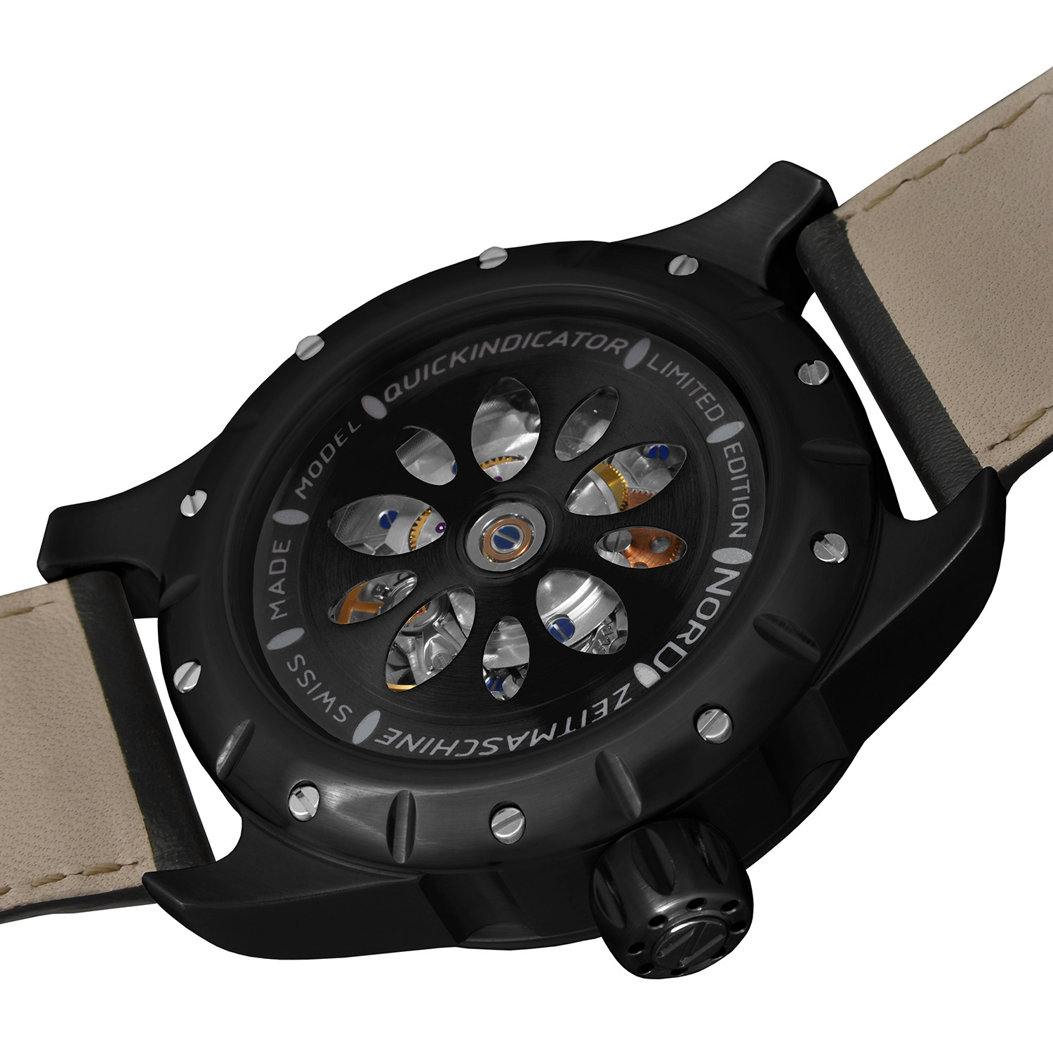 The minute hand of the Quickindicator makes 3 revolutions per hour and travels in 60 minutes over a minute track of 205mm length, which means the hand (top) travels with a speed of 205mm/hour. Because of this, Quickindicator is the name of the watch. The Quickindicator has possibly the fastest minute hand in any mechanical wristwatch. Traveling on three overlapping ovoid-minute tracks, the minute hand has two axes of rotation, one of the hand itself, and the other the rotating platform the hand is mounted on.