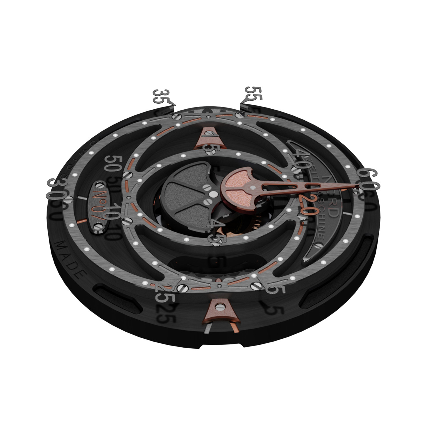 Daniel Nebel’s search for an innovative time display started from the premise that in most mechanical watches with decentralized hands, retrograde faces or disc dials, the displaying element (hand, disc, cage, etc.) always turned on a fixed axle. This means that the displaying element always shows the time on a steady, constant radius, which usually makes a complete revolution or, in the case of retrograde dials for example, a revolution of 120 degrees. Not having a fixed point for the attachment of the hand, therefore, appeared to him to be the solution for inventing a new kind of display. After many experiments with eccentrics and levers, he managed to create many different types of display, but ultimately these did not provide him with a satisfactory result, because the displays that emerged were either too small, were crossed in the middle, or were not visually attractive. Only the solution with the two opposing eccentrics, arranged decentrally on the watch, fulfilled the objective of an innovative time display that can be easily read.