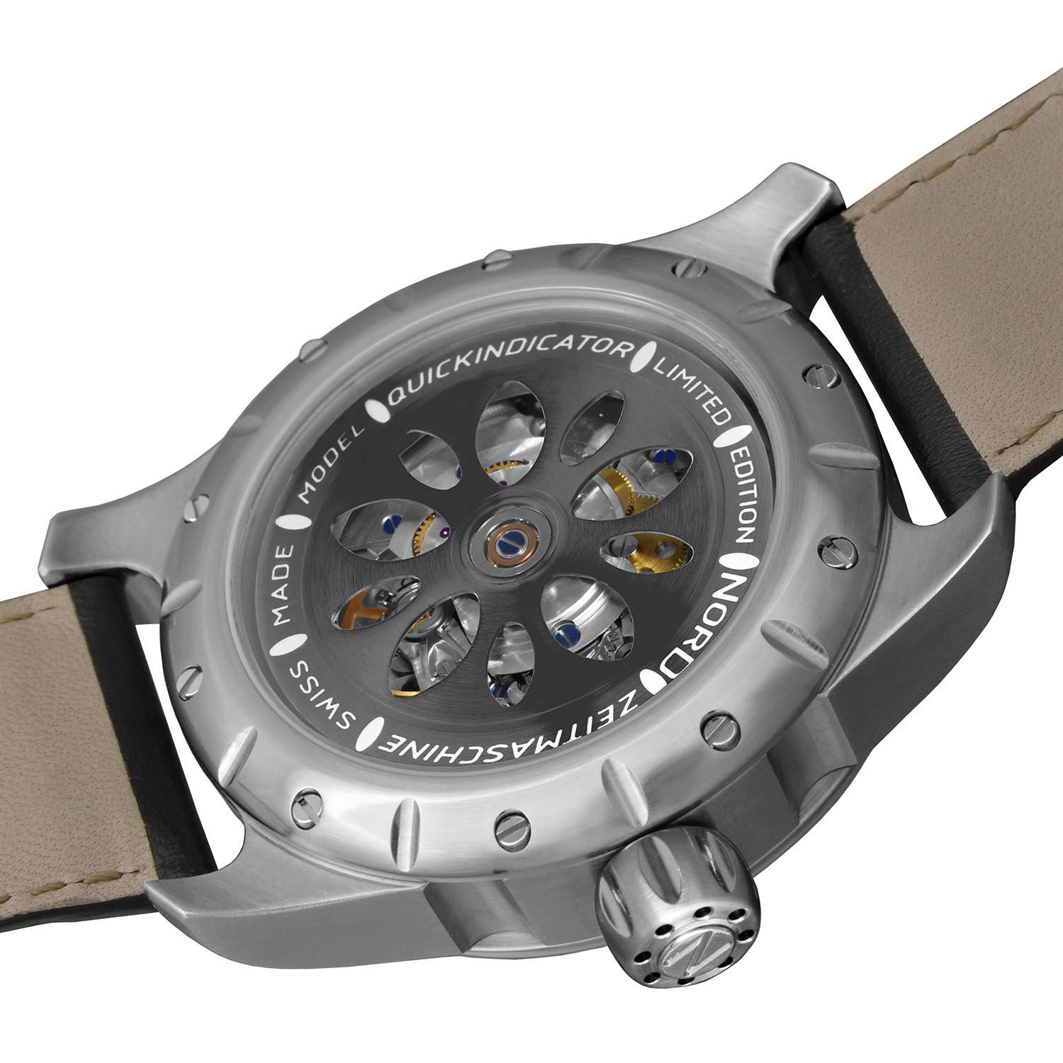 The minute hand of the Quickindicator makes 3 revolutions per hour and travels in 60 minutes over a minute track of 205mm length, which means the hand (top) travels with a speed of 205mm/hour. Because of this, Quickindicator is the name of the watch. The Quickindicator has possibly the fastest minute hand in any mechanical wristwatch. Traveling on three overlapping ovoid-minute tracks, the minute hand has two axes of rotation, one of the hand itself, and the other the rotating platform the hand is mounted on.
