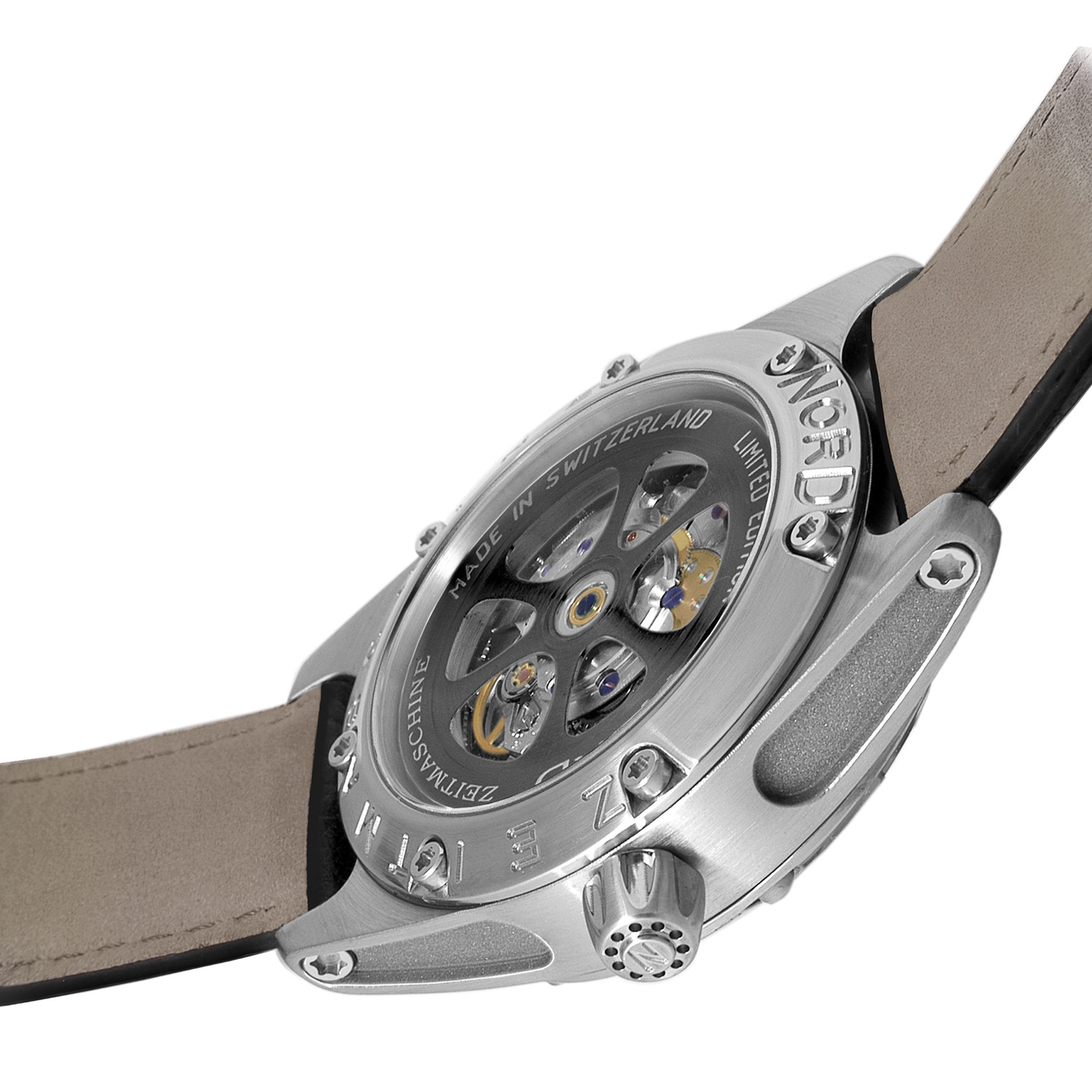 Daniel Nebel’s search for an innovative time display started from the premise that in most mechanical watches with decentralized hands, retrograde faces or disc dials, the displaying element (hand, disc, cage, etc.) always turned on a fixed axle. This means that the displaying element always shows the time on a steady, constant radius, which usually makes a complete revolution or, in the case of retrograde dials for example, a revolution of 120 degrees. Not having a fixed point for the attachment of the hand, therefore, appeared to him to be the solution for inventing a new kind of display. After many experiments with eccentrics and levers, he managed to create many different types of display, but ultimately these did not provide him with a satisfactory result, because the displays that emerged were either too small, were crossed in the middle, or were not visually attractive. Only the solution with the two opposing eccentrics, arranged decentrally on the watch, fulfilled the objective of an innovative time display that can be easily read.