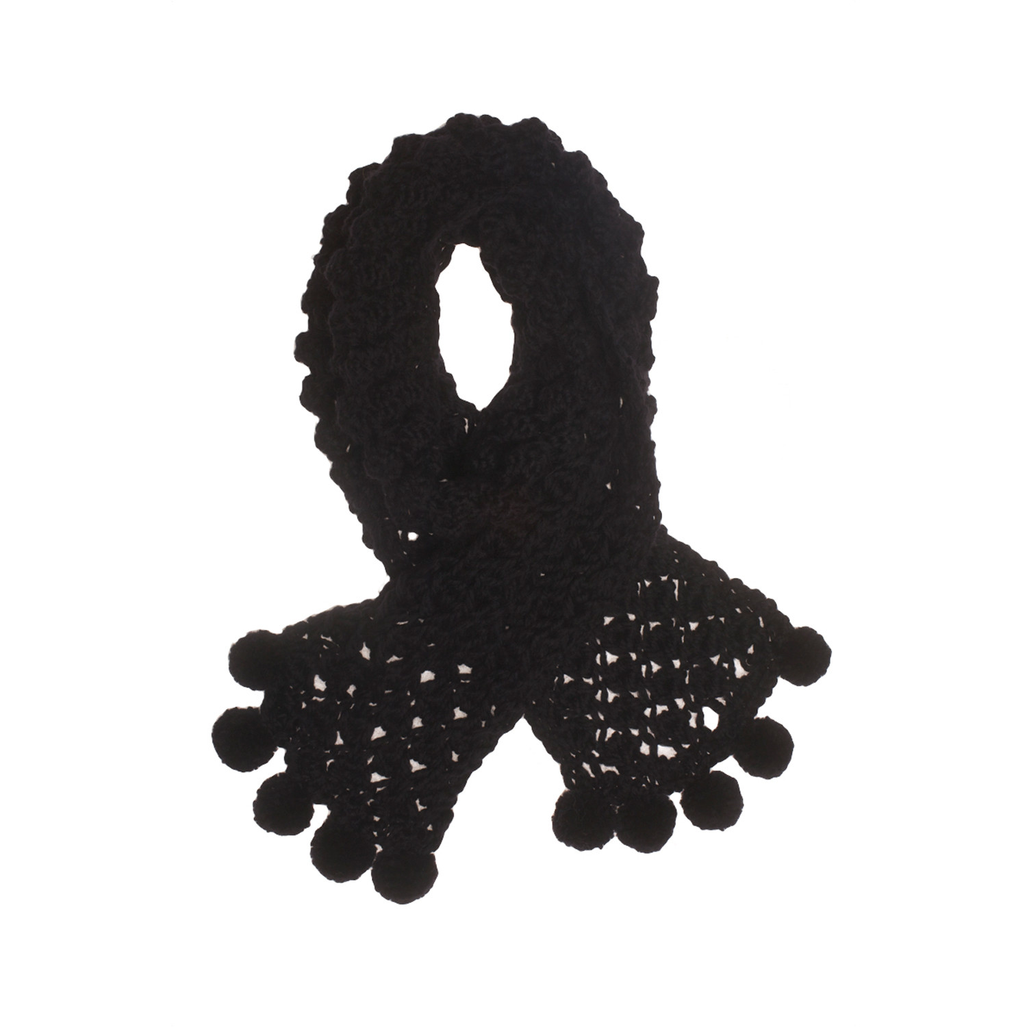 This merino wool scarf was hand-made with vintage, limited-edition yarns in a thick, luxurious knit. The edges are accented with fringe poms while the length features delightful miniature accents.