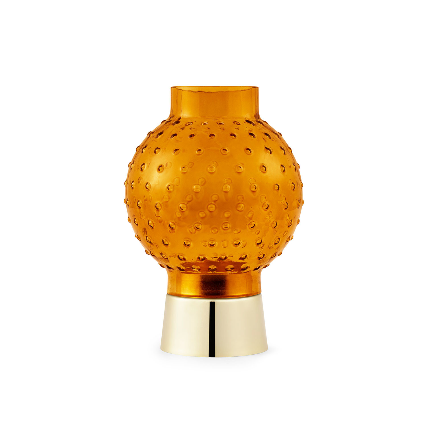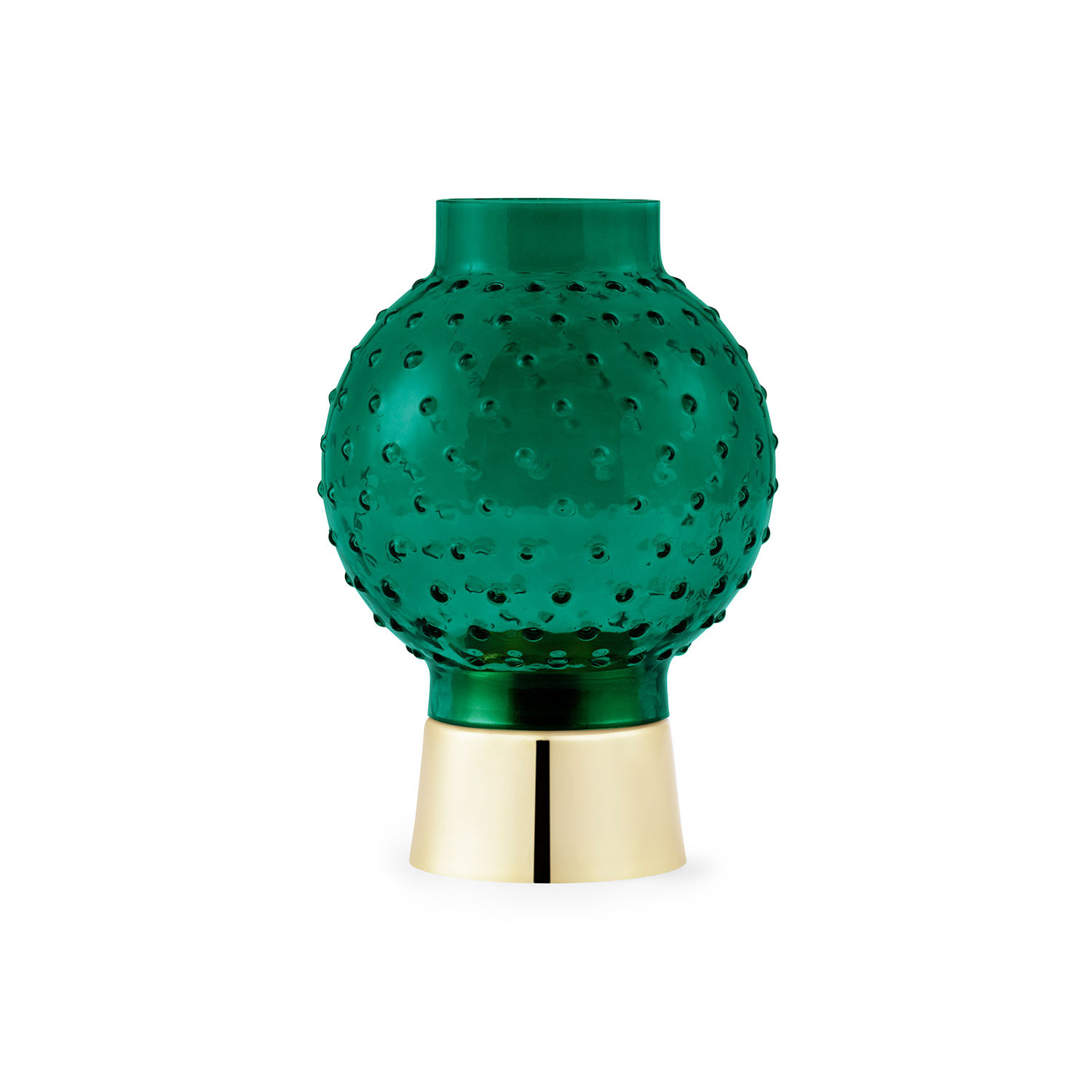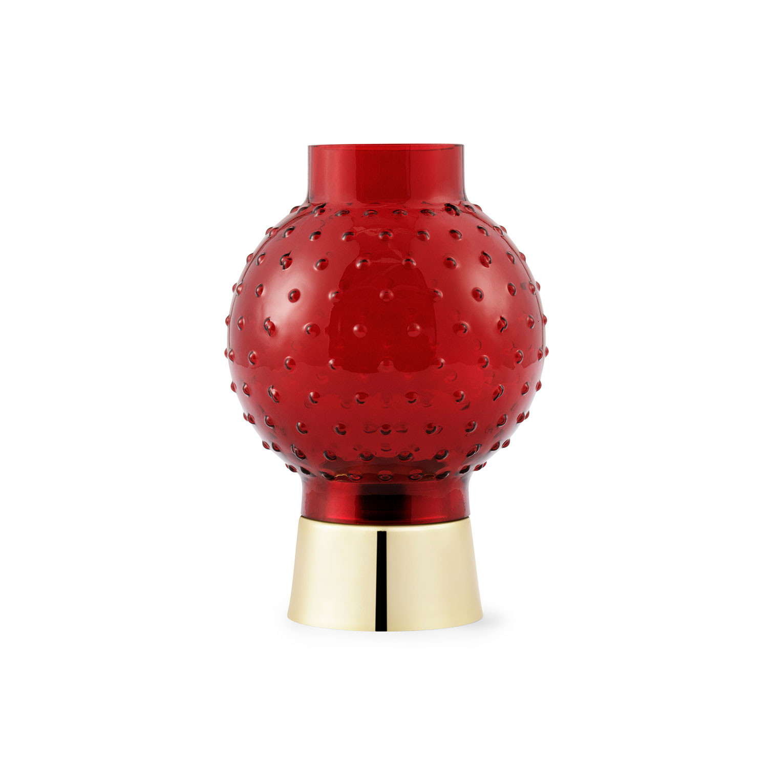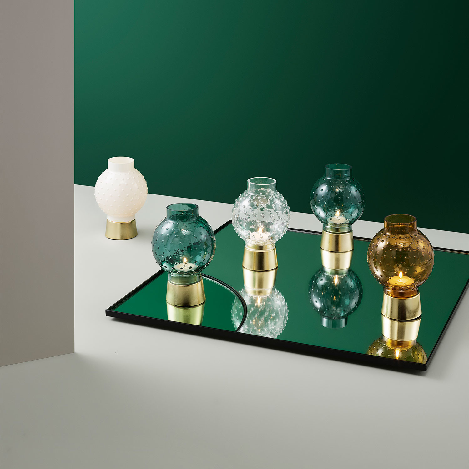 The Story Tealight Holder is made in colored glass with a steel base with brass coating. Simply lift the glass lid to place the candle.
