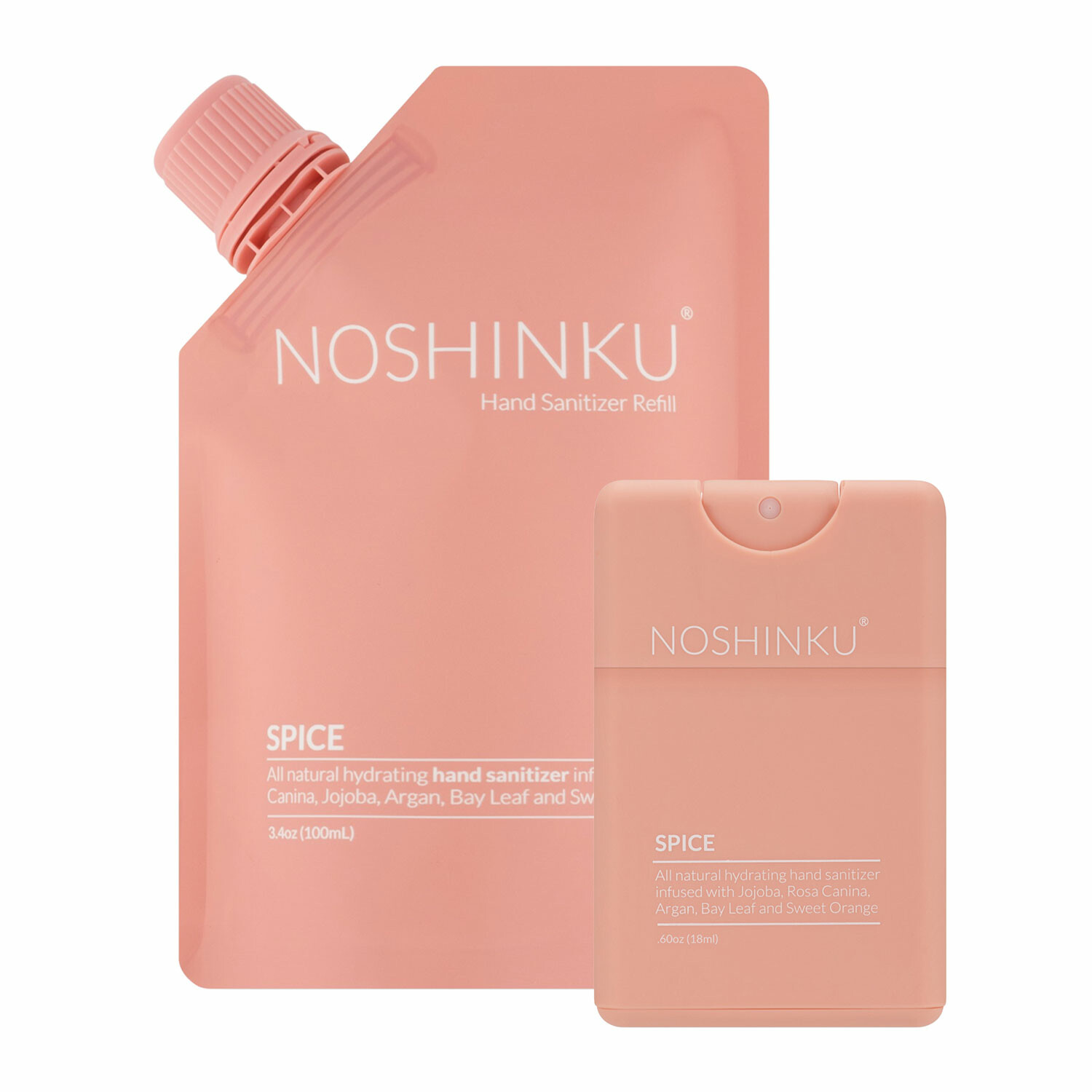 The Noshinku Sanitizer DUO combines an ingenious, pocket-sized hand sanitizer bottle and a handy refill pouch with enough sanitizer for 5 full refills so you can keep hands germ-free without the waste. Noshinku's nourishing, hydrating sanitizer is made with 70% pharma-grade ethyl alcohol distilled from organic cane sugar alongside a conditioning blend of aloe, rosa canina, jojoba, and argan oils to soothe, moisturize, and protect skin. Each pocket sprayer holds approximately 270 sprays to keep your hands clean while on the go, and is easy to refill in seconds.