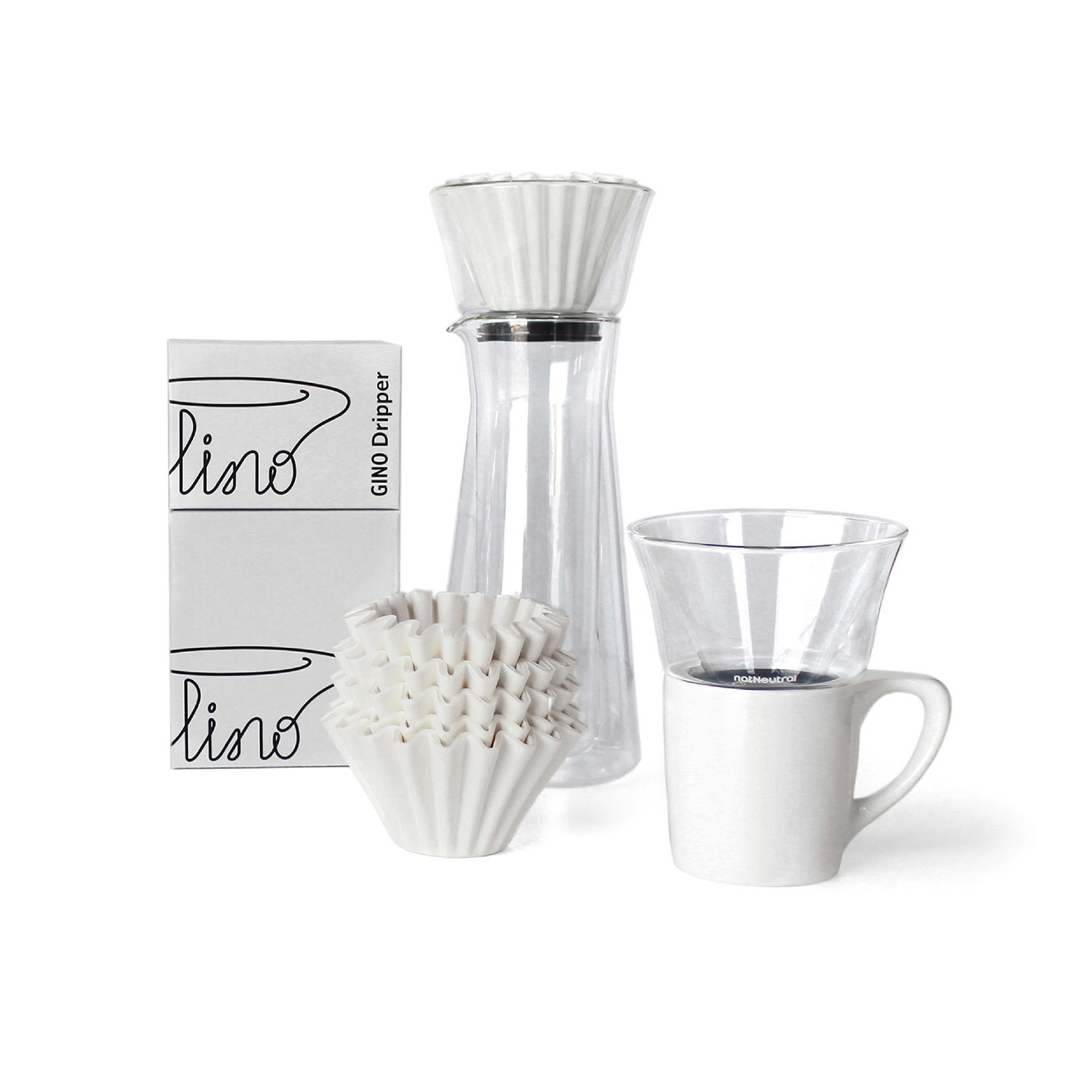 This Deluxe Pour Over Brewing Kit offers a coffee brewing experience that not only delivers an expertly brewed cup, but also pleases all five senses: touch, sight, sound, smell, and taste. The double-walled glass construction of the GINO dripper insulates while highlighting the coffee extraction. The angle of the interior cone and size of the 3 holes at the bottom are engineered to ensure the optimal distance for water to travel through the coffee bed, ensuring a balanced, flavorful cup. The minimal profile is gracefully tapered to sit atop the LINO mug like a crown, and also comfortably fit any grip. Once the coffee is brewed, the thick base of the LINO mug retains heat, while the rim has an elegant mouth feel. The iconic LINO handle is a fluid extension of the cup itself, providing a resting place for the thumb to balance the cup effortlessly in the hand. This union of great design and great function is now available to the coffee enthusiast conveniently packaged as a coordinating set.