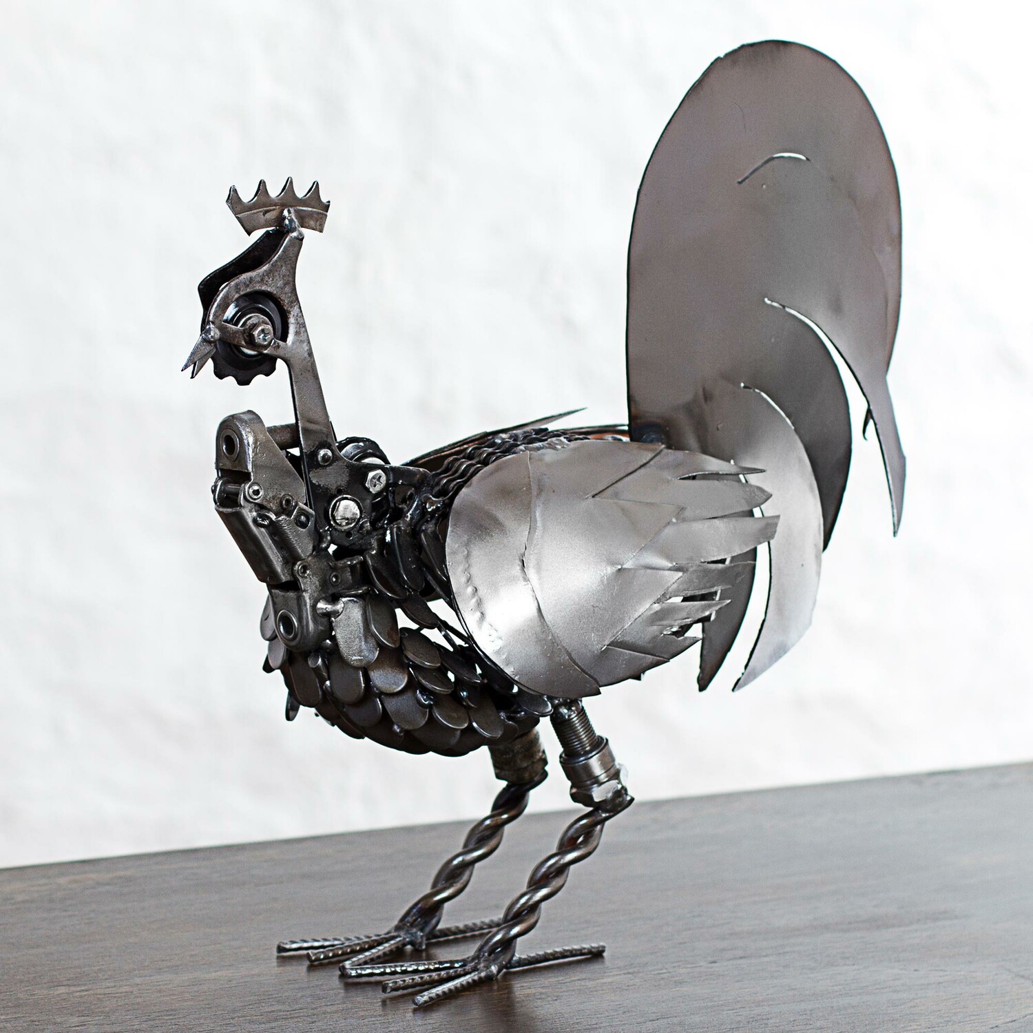 With a striking industrial look, this rooster sculpture is as charming as it is environmentally-friendly. The artisan does not give his sculptures a fine polished finish, therefore smudges and scratches may be present.
