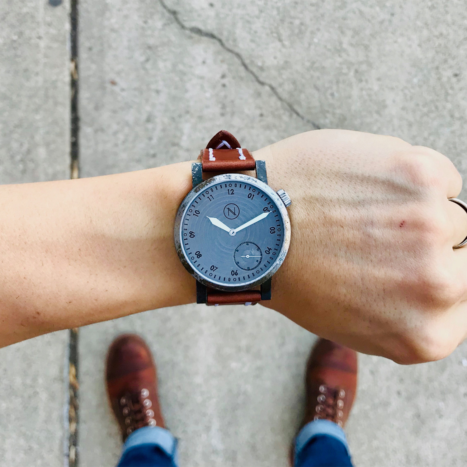 Their quality steel rail now functions as the dial, case, and caseback of this hand built and individually numbered timepiece, a limited edition of only 5 pieces. The strap is made from Hermann Oak leather from one of the finest tanneries in the USA. This edition is packaged in a Canadian-made wood box. And of course the craftsmen who make your watch are human, not machines, ensuring your timepiece is completely unique in finish. Because these watches are made by hand, please allow for minor differences in color and texture.