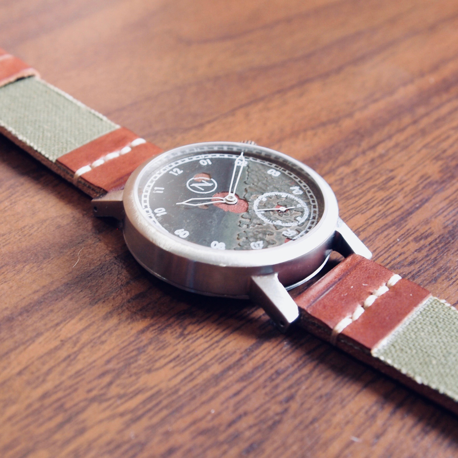 The strap is equally unique, made from a vintage Royal Air Force (RAF) GQ 60 foot utility parachute deployment bag. This was an issued stock item and not war reserved. It was serviced at RAF Hullavington, Wiltshire and dispatched to 47 Air Dispatch, RAF Lyneham for deployment from C-130 Hercules of RAF Support Command for heavy drop. It has four layers, bonded together with flexible polymer, making it waterproof, strong, and probably one of the most pliable canvas straps available. Stitched in a light colored thread with two canvas keepers, it is made to fray and wear slightly over time.