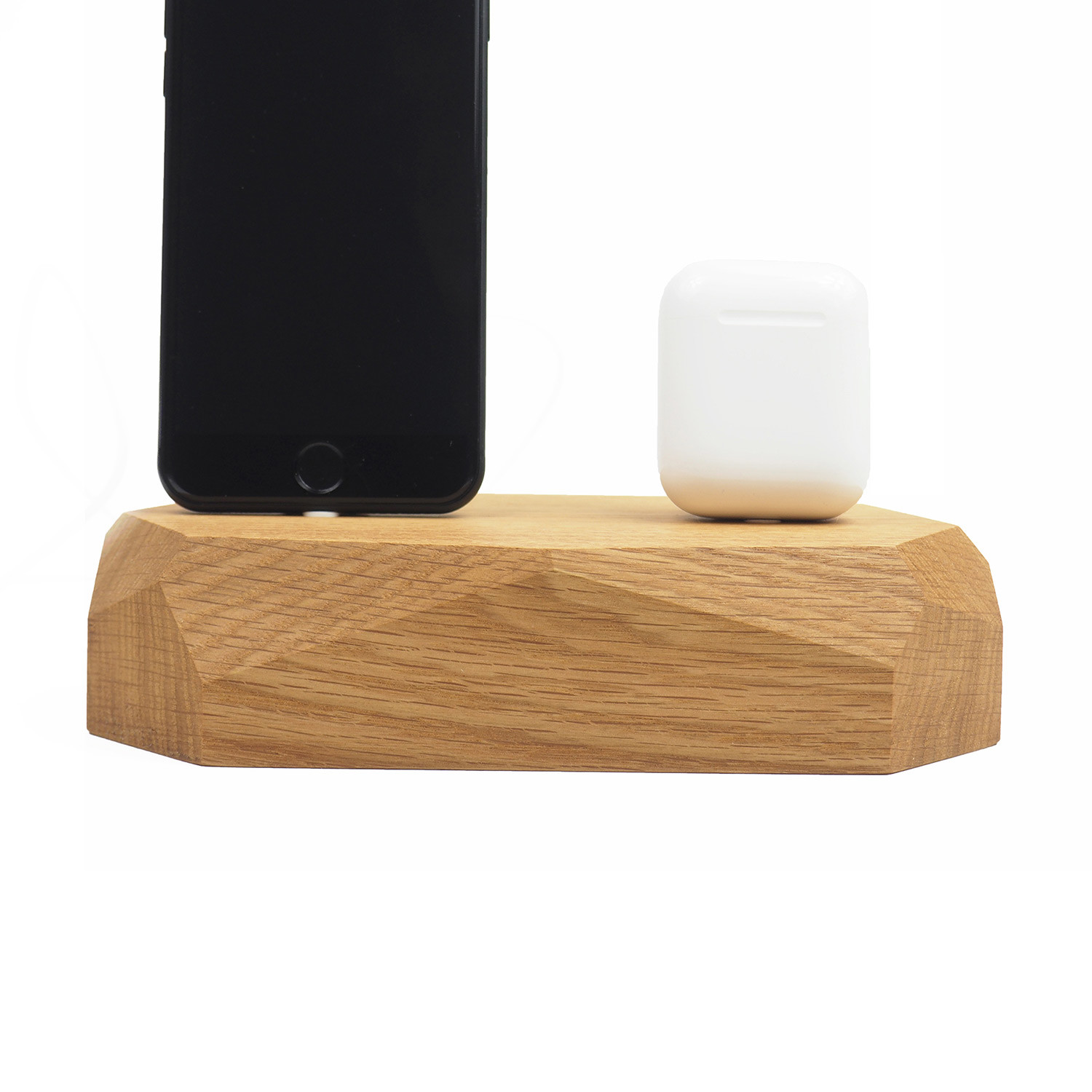 Clean and minimalist, this iPhone Dual Dock is a simple piece handcrafted from solid wood. Complete with a cable locking system, you can easily dock your iPhone or Airpods with one hand, making it a uniquely stylish and convenient addition to any desk or bedside table.