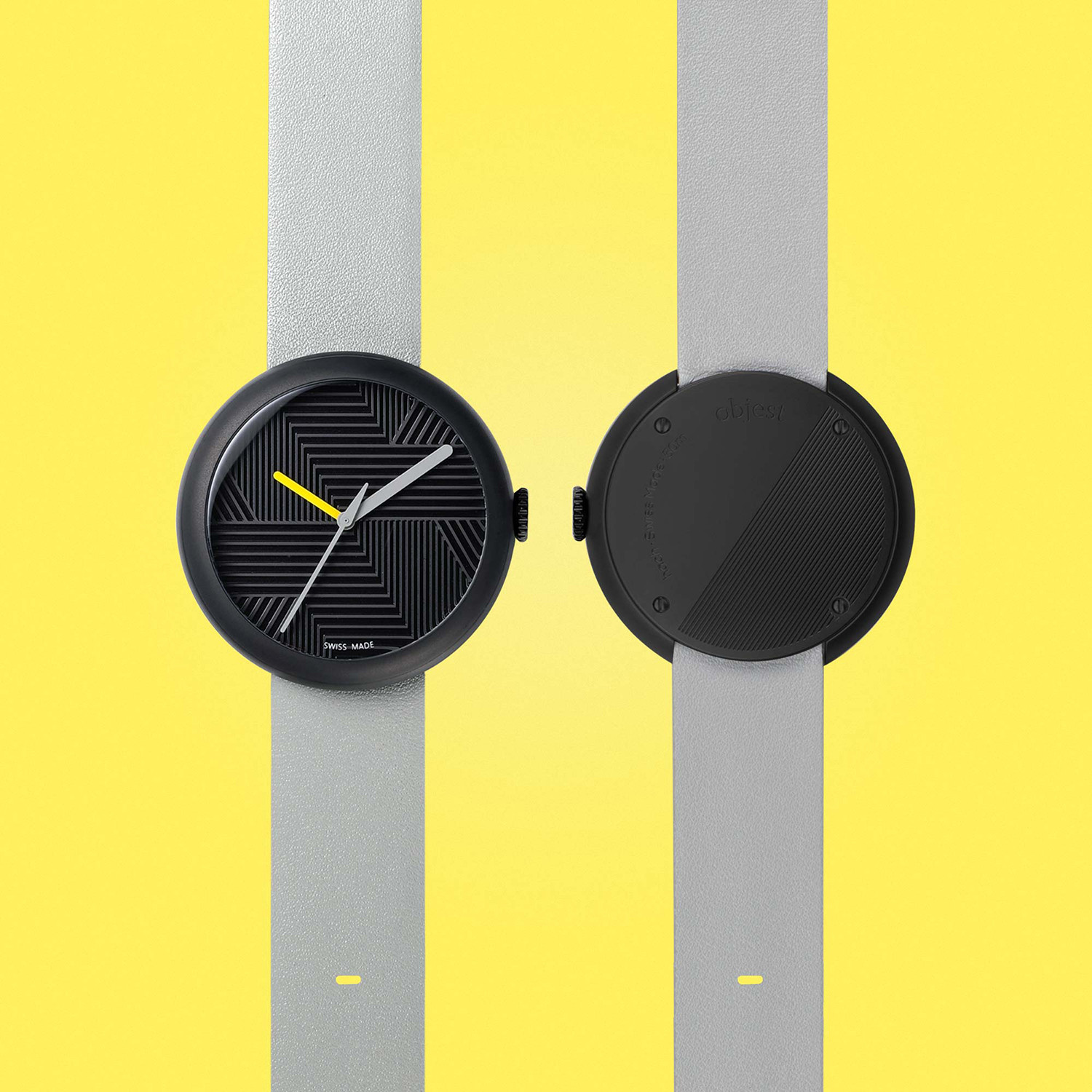 This Hach Quartz comes from Objest's first collection of Swiss-Made contemporary design watches. The unisex timepieces features a numberless dial design, with a three-dimensional hatched pattern indicating the twelve indices of a traditional watch face. Hach is simple, playful, premium, defined by its purity of color and its matte black Diamond-Like Carbon (DLC) coating.