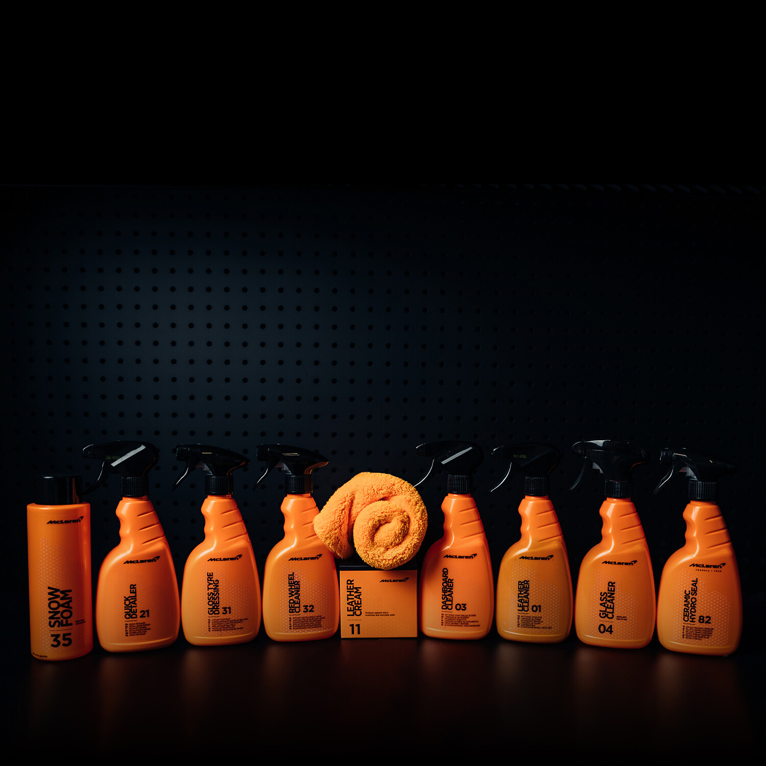 The McLaren Champion Full Car Kit includes everything you ever needed to keep your car clean and protected, inside and outside. It features a selection of their best products including the Snow Foam Shampoo, Wheel Cleaner, Tire Shine, Ceramic Hydro Seal, Dashboard Cleaner, Leather Cleaner, Leather Cream, and a McLaren Polishing Microfber Towel.