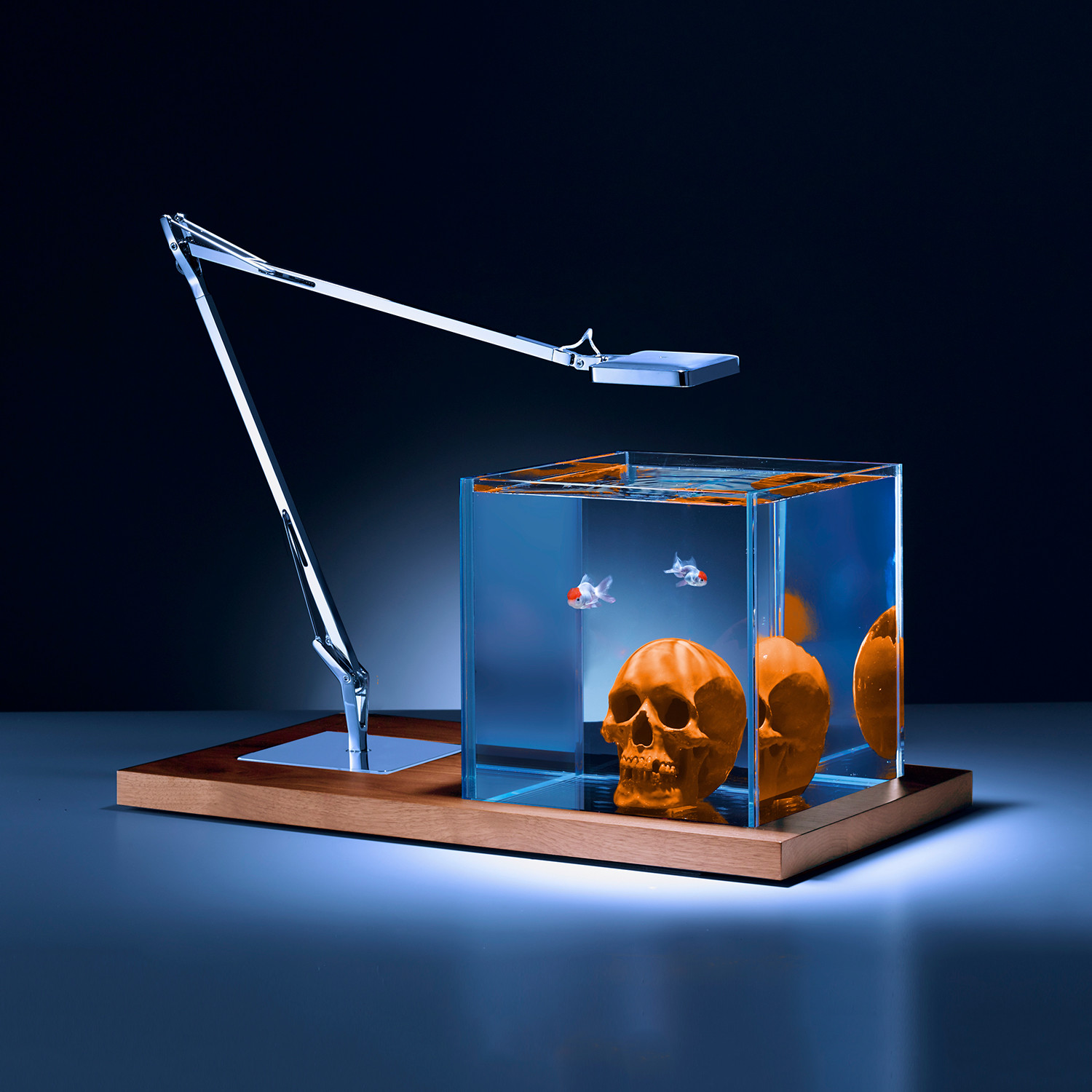 The tank is an 11" optically clear, beveled glass cube recessed in a walnut base, and the hand-painted resin skull decoration is included, along with a complete lighting and filtration system, for a small, easy-to-care-for ecosystem that can live right on your desk, coffee table or bookshelf.