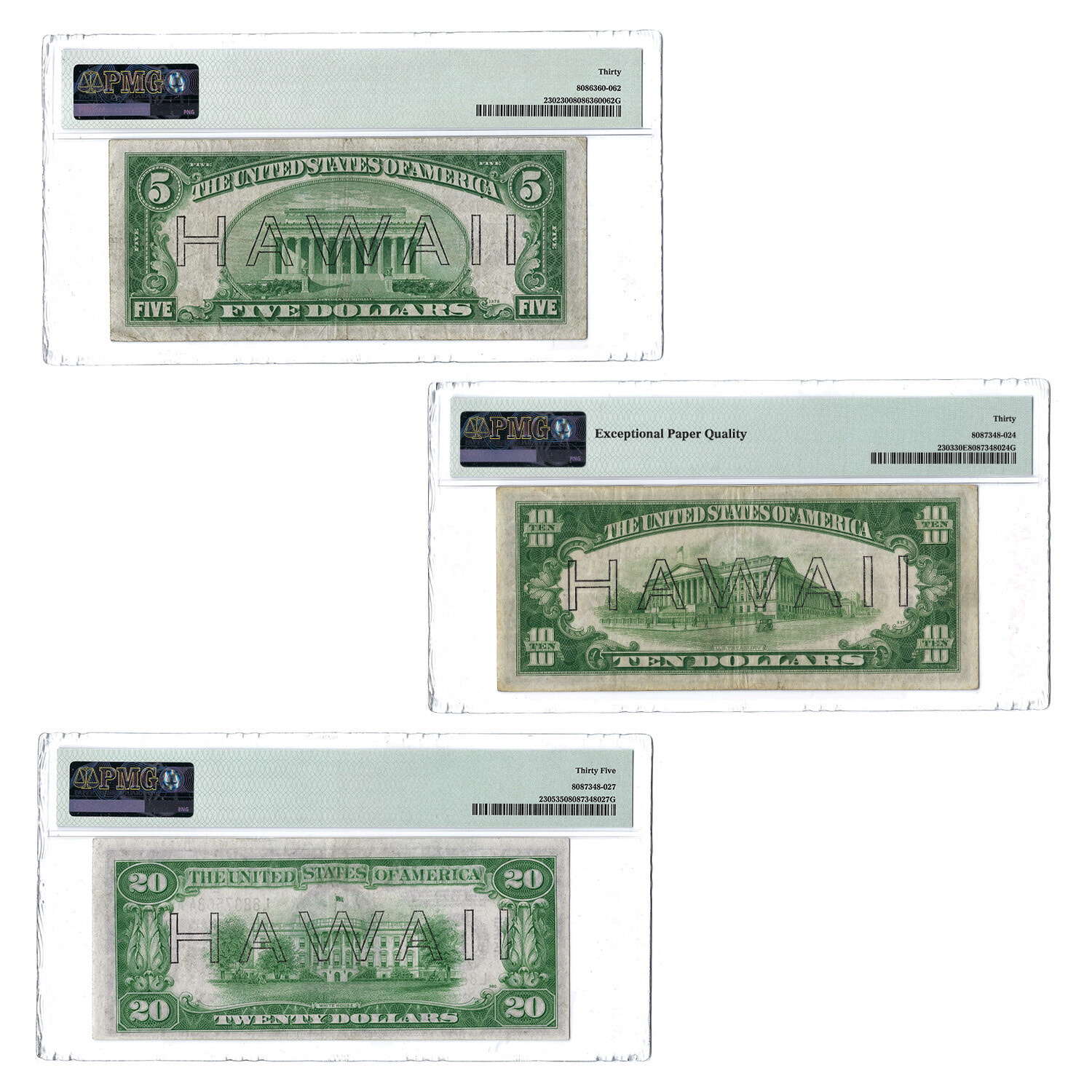 1934A Hawaii WWII Emergency Issue Federal Reserve Notes // $5 - $10 - $20 Set of 3 // PMG Certified VF30 to VF35