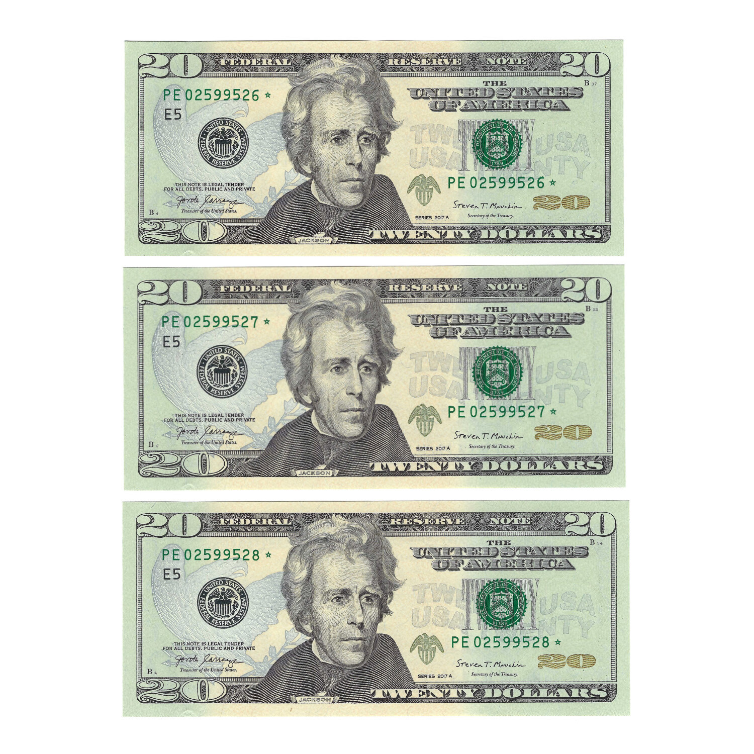 2017A $20 Small Size Federal Reserve Note // Set of 3 Star Noteses // Deluxe Collector's Pouch