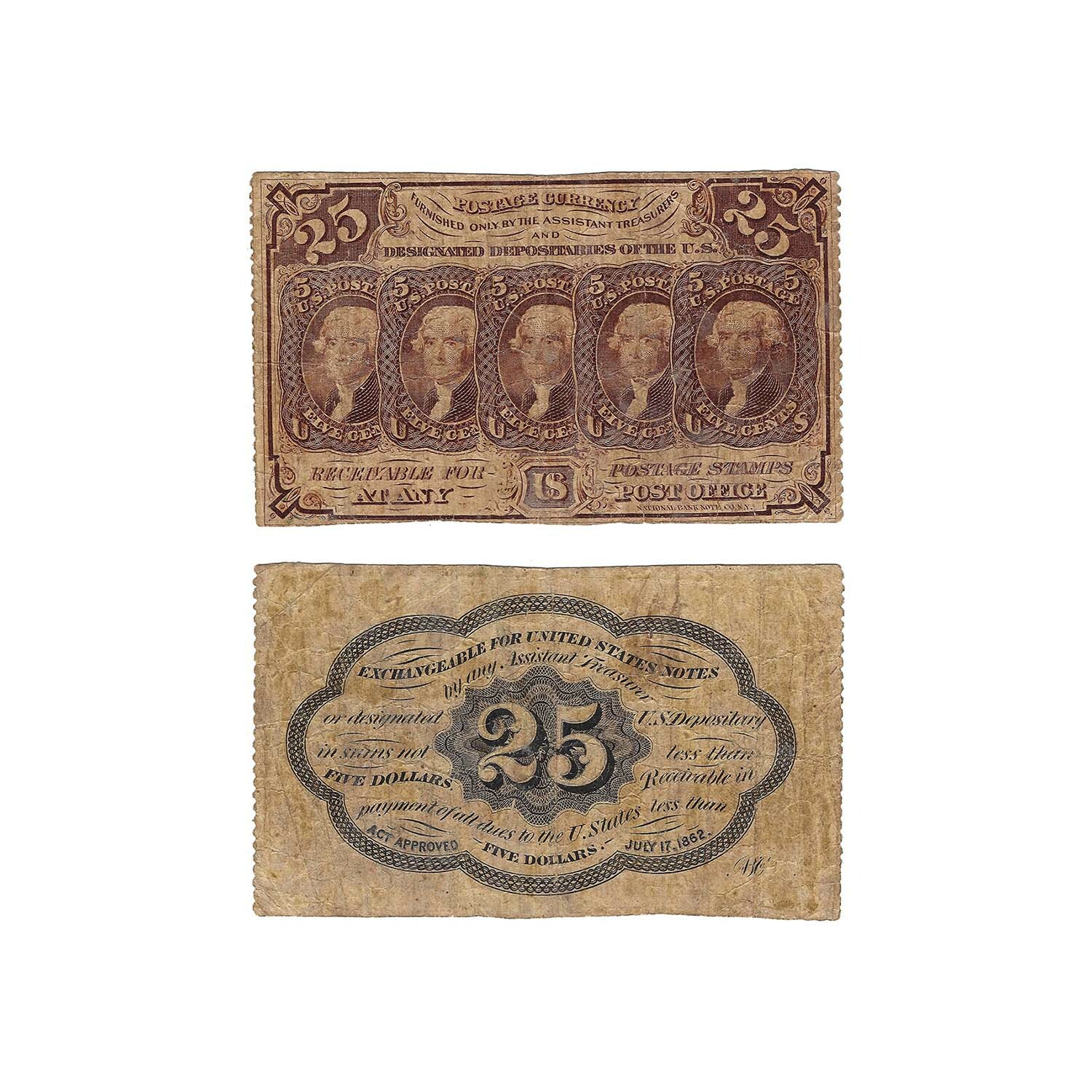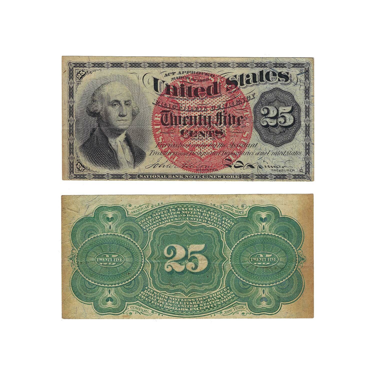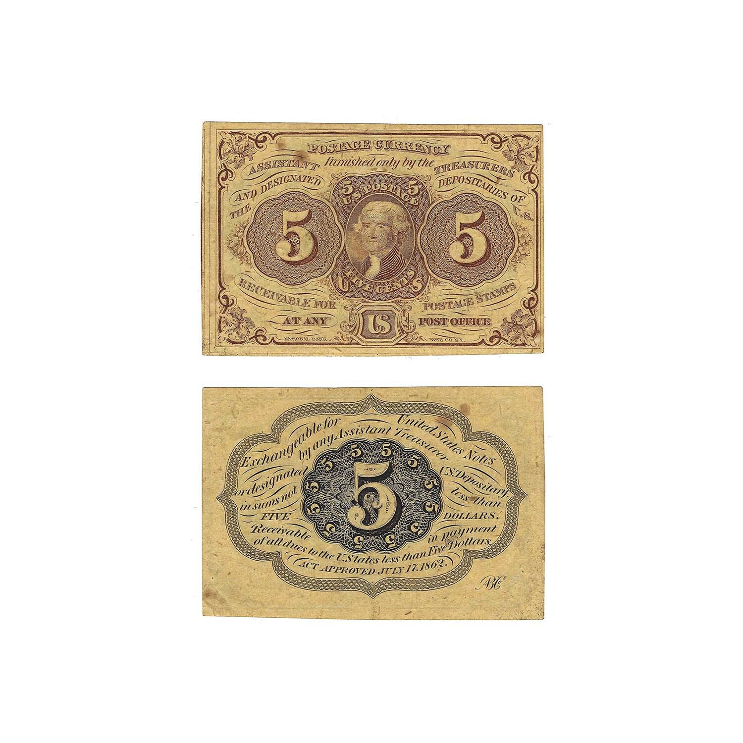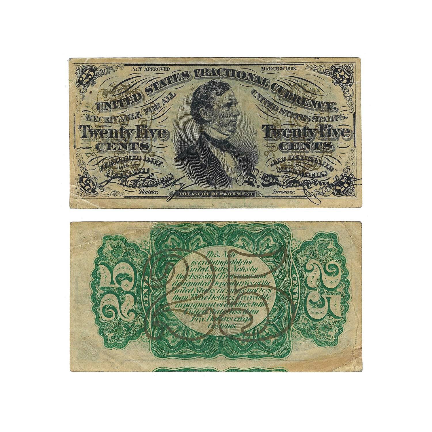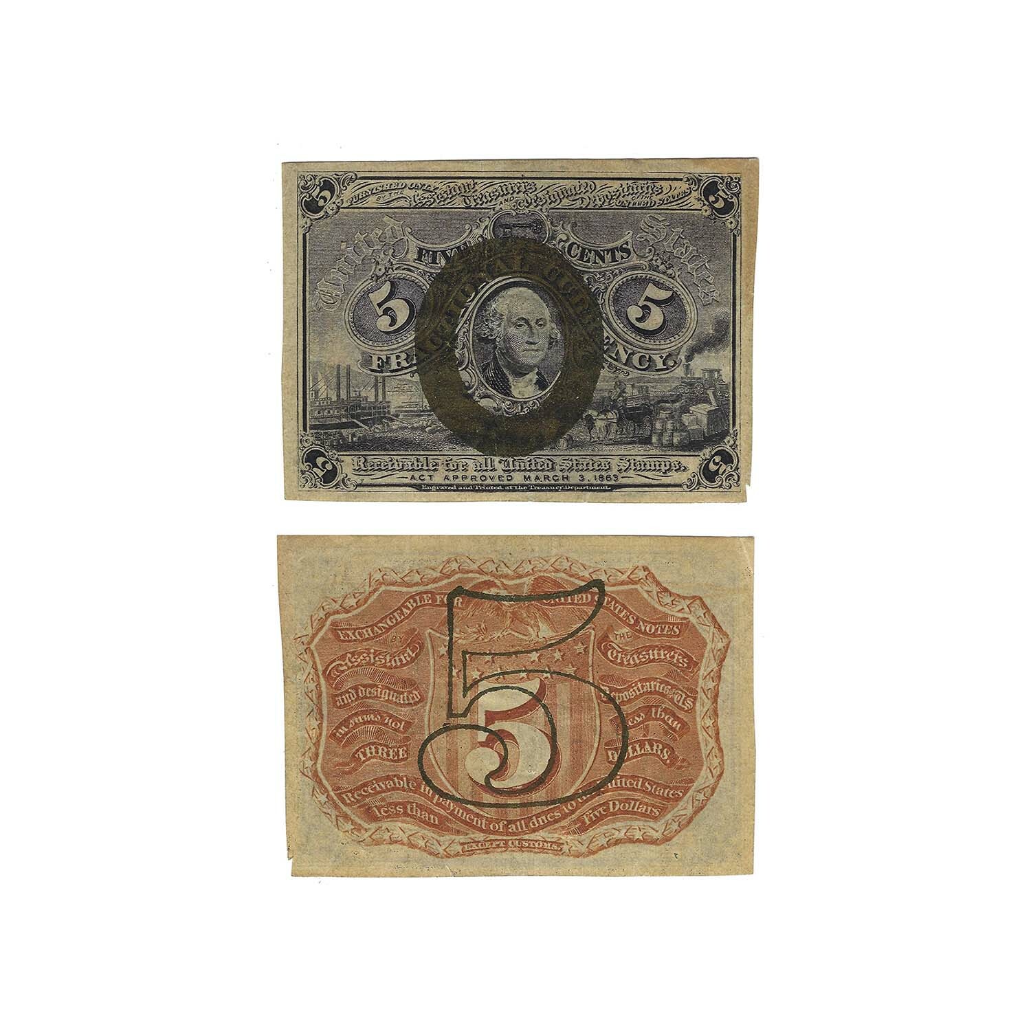 Most individuals today are highly surprised to hear of genuine U.S. paper currency with a face value of under one dollar, yet this was not always so. During the early years of the Civil War, banks suspended payments of metal coin, an act which led to a premium on all coins remaining in circulation. Coins were immediately hoarded and guarded by the public and all but disappeared from circulation. In response, the government a total of 5 issues of small currency over a 14-year period from 1862 to 1876 in denominations of 3, 5, 10, 15, 25, and 50 Cents. The later issues were known as Fractional Currency. A total of 369 million dollars of this currency was issued and it is estimated that 2 million dollars remains outstanding, most of which is presumed to have been lost or destroyed. The few notes that remain in the hands of collectors are peculiar relics of a notoriously difficult period in American financial history.
