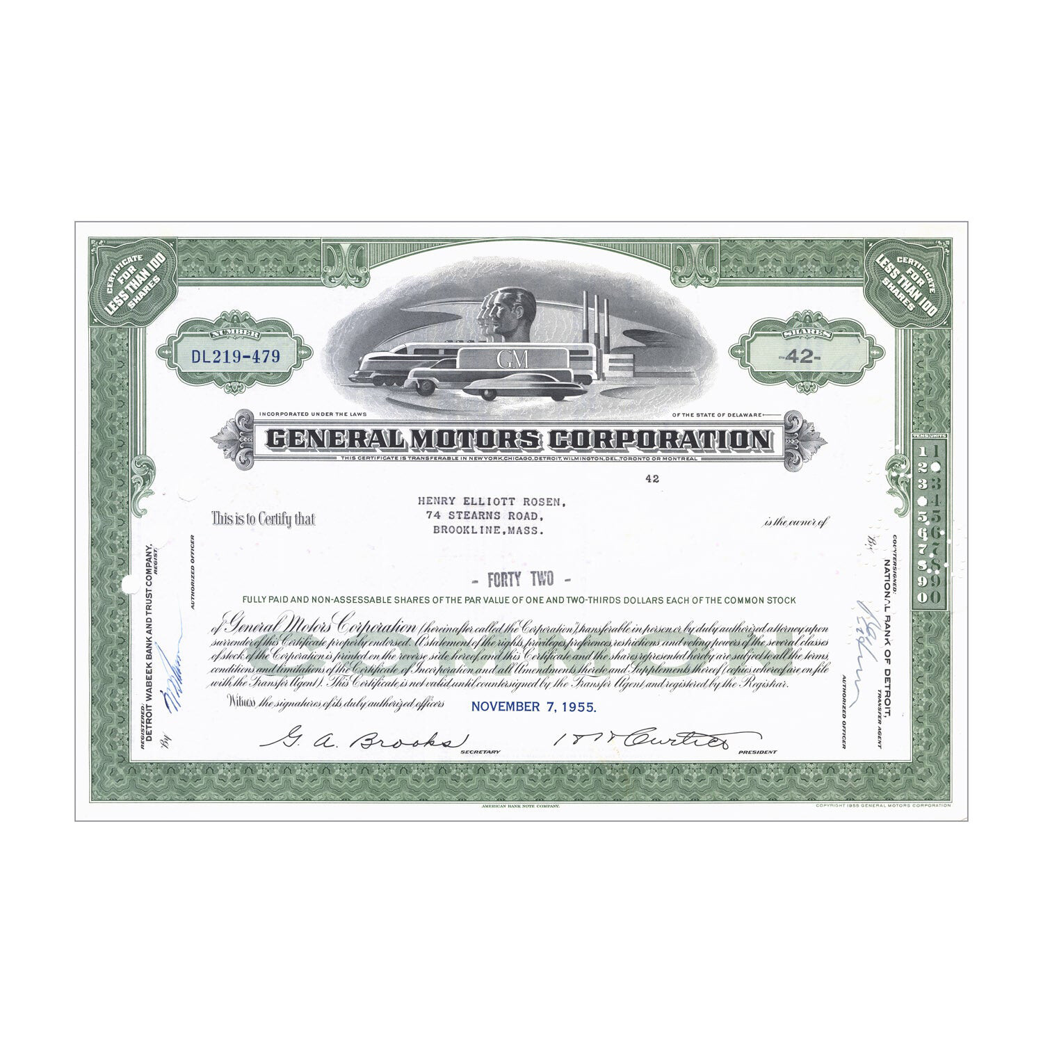 General Motors Stock Certificate // 1-99 Shares // Green // 1960s-80s