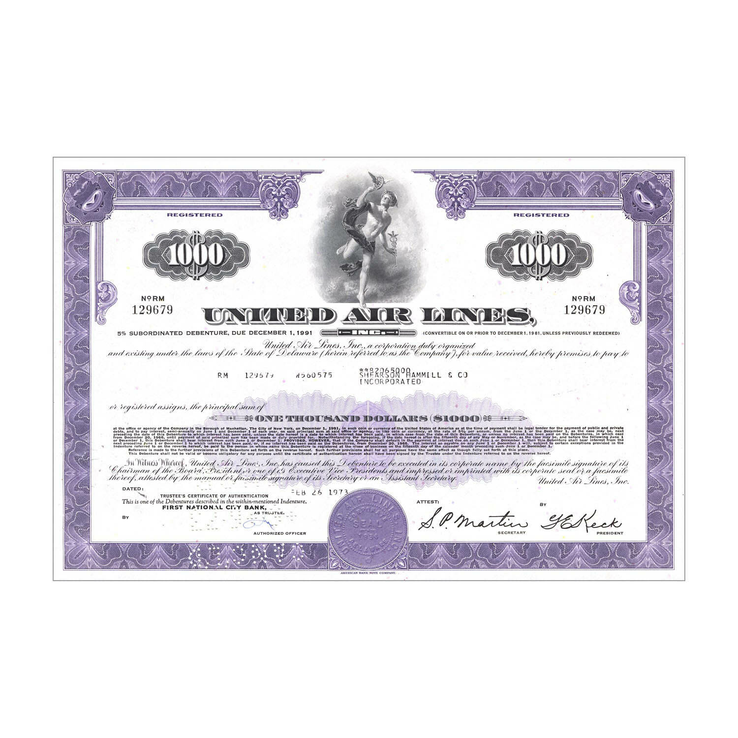 United Airlines Inc. Stock Certificate // 1,000 Shares // Purple // 1970s