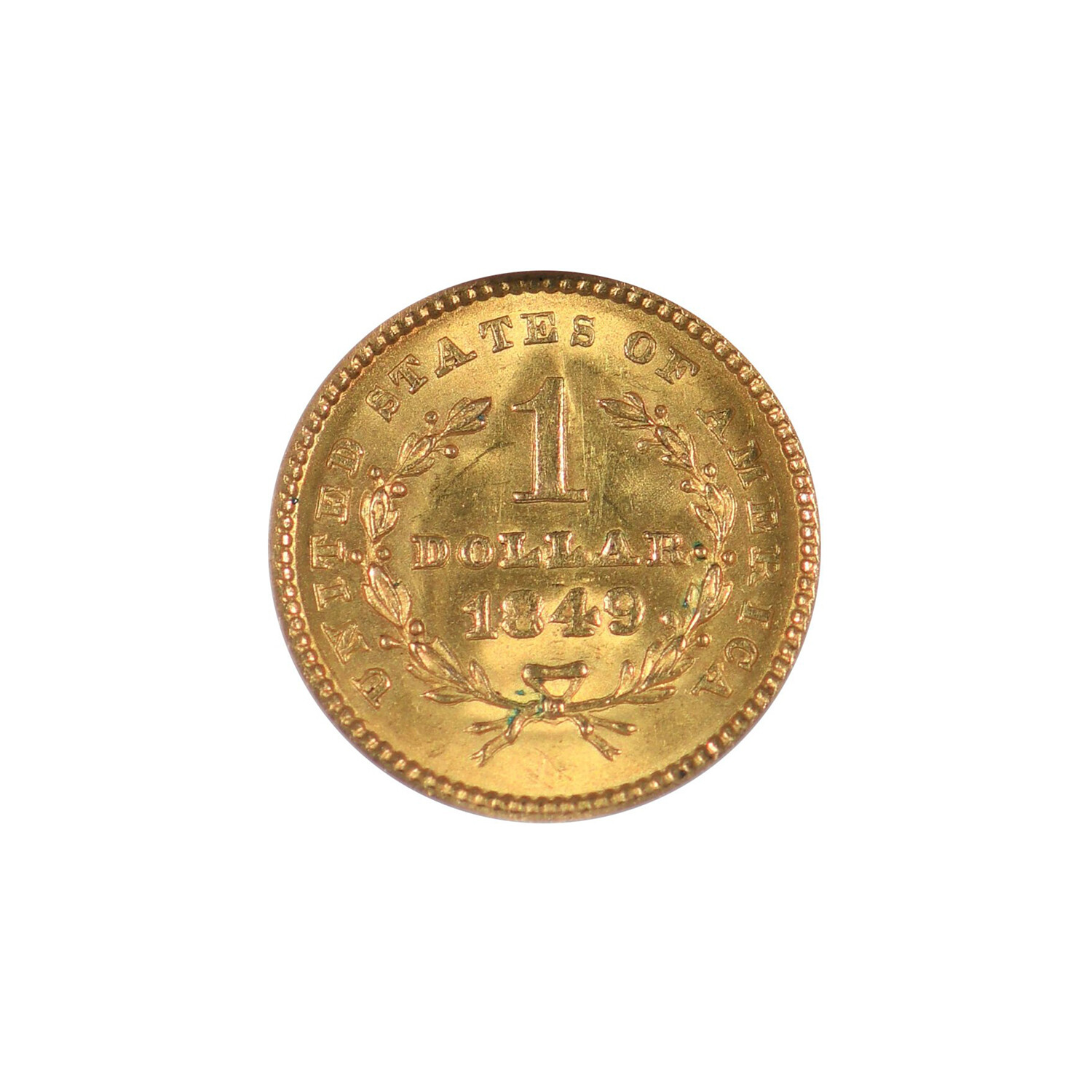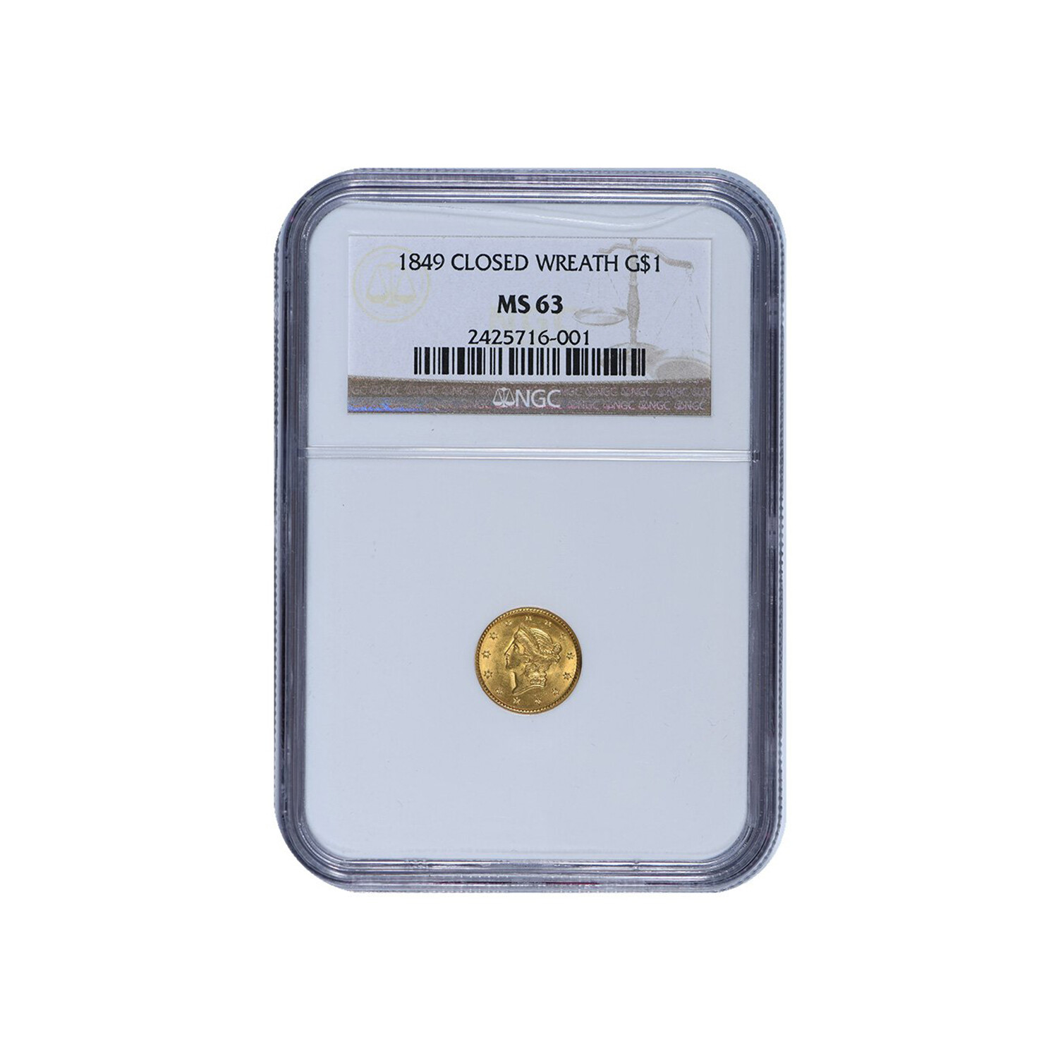 1849 Liberty Head $1 Gold Piece // Type 1, Closed Wreath // NGC Certified MS63 // Wood Presentation Box