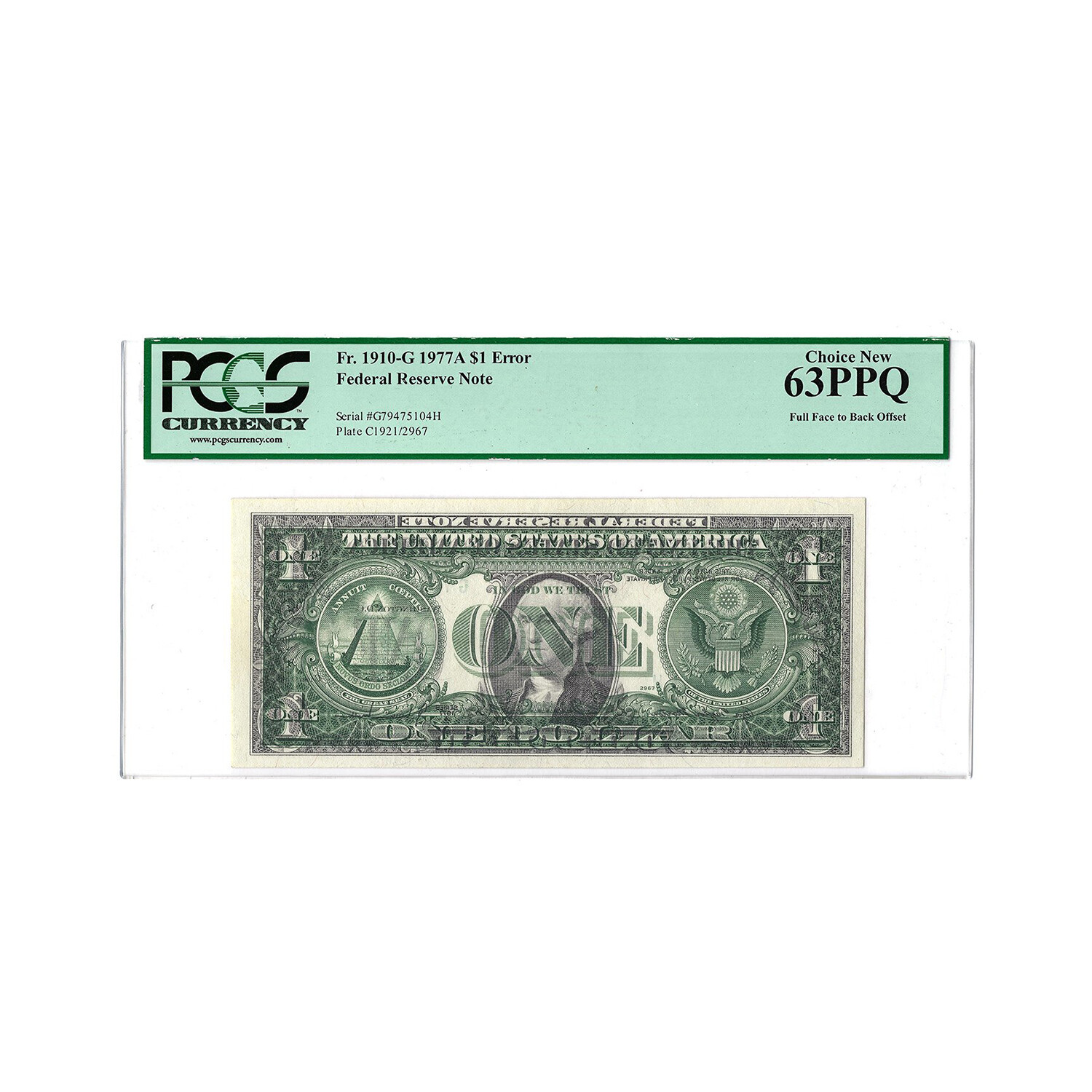 1977-A $1 Federal Reserve Note // Full Face to Back Offset Printing Error // PCGS Certified Choice Unc. 63 PPQ