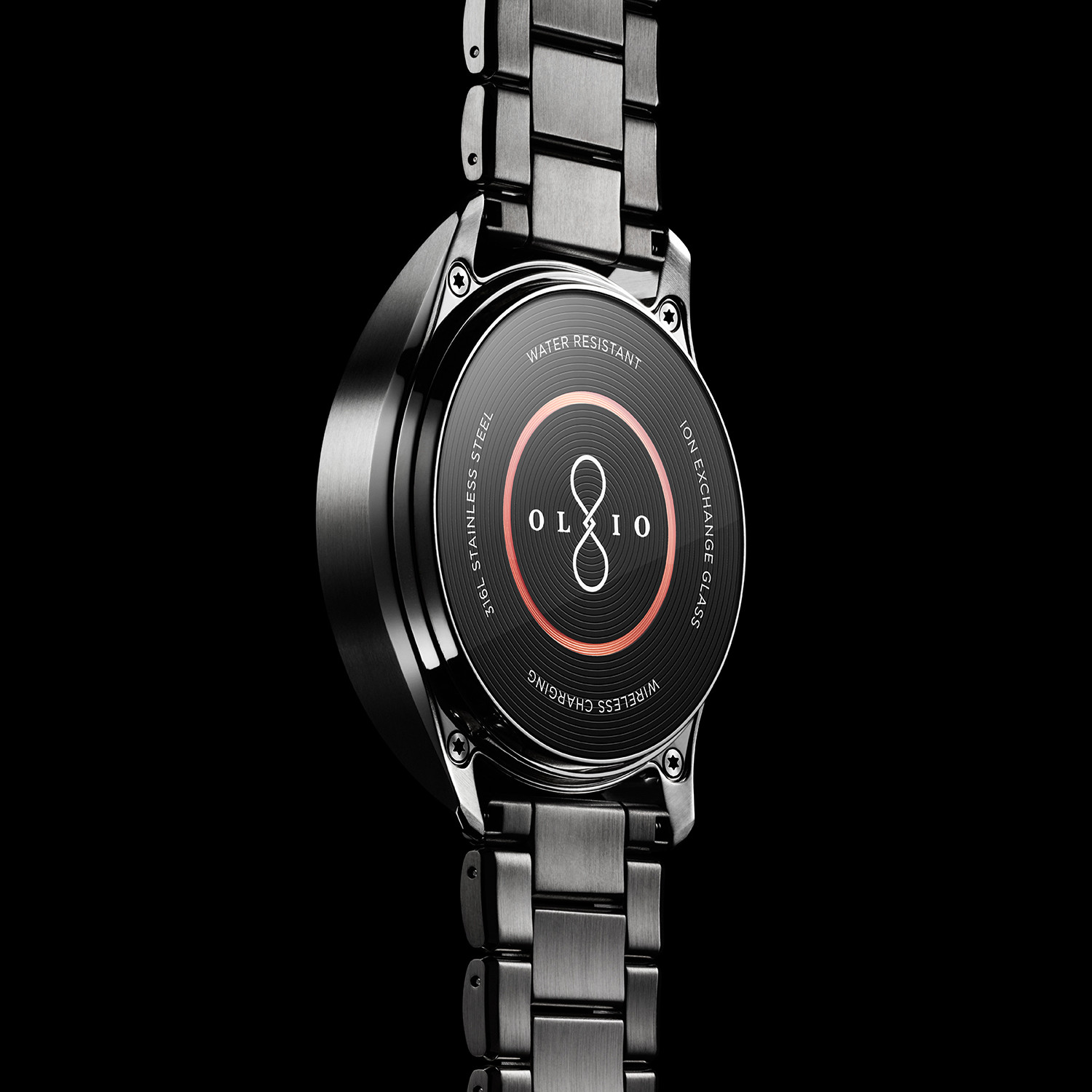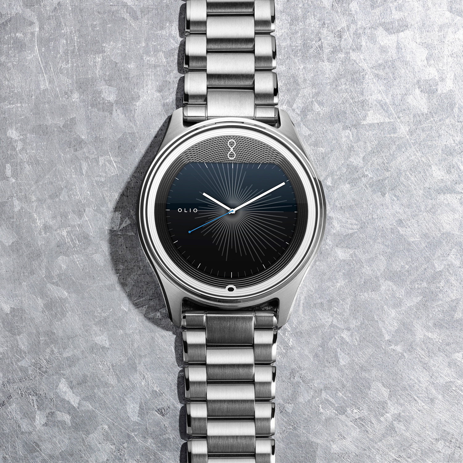 The Olio Model One Steel Collection timepiece is made from 316L stainless steel, cold-forged nine times for hardness, milled, then hand finished with a fine hairline texture and mirror-polished highlights. It features a custom high resolution, round full color display and a state-of-the-art high cycle life battery that provides up to two days of battery life.
