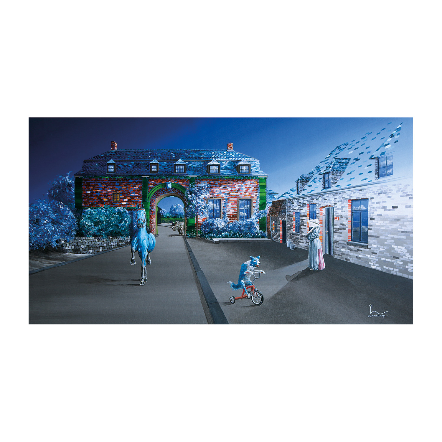The contemporary surrealism of Arcadia is evident not only from the animal presence in the small village setting, but in the way the rooftop seemingly blends away into the sky above. The blue dog riding a tricycle across the street is meant to express a whimsicality often found in the artist’s works.