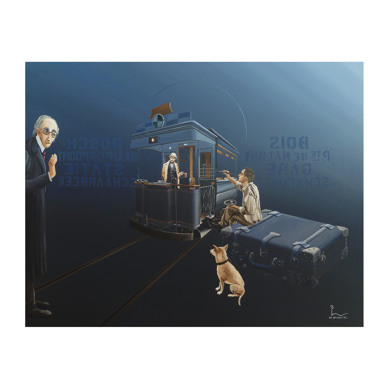 Belgian surrealist Paul Delvaux, one of Lamboray’s strongest influences, is honored in this piece. Featured off to the side of the piece, Delvaux’s life’s work as a tram operator is prominently featured against a landscape without a horizon to free the artist and his subject from the seriousness of the world.