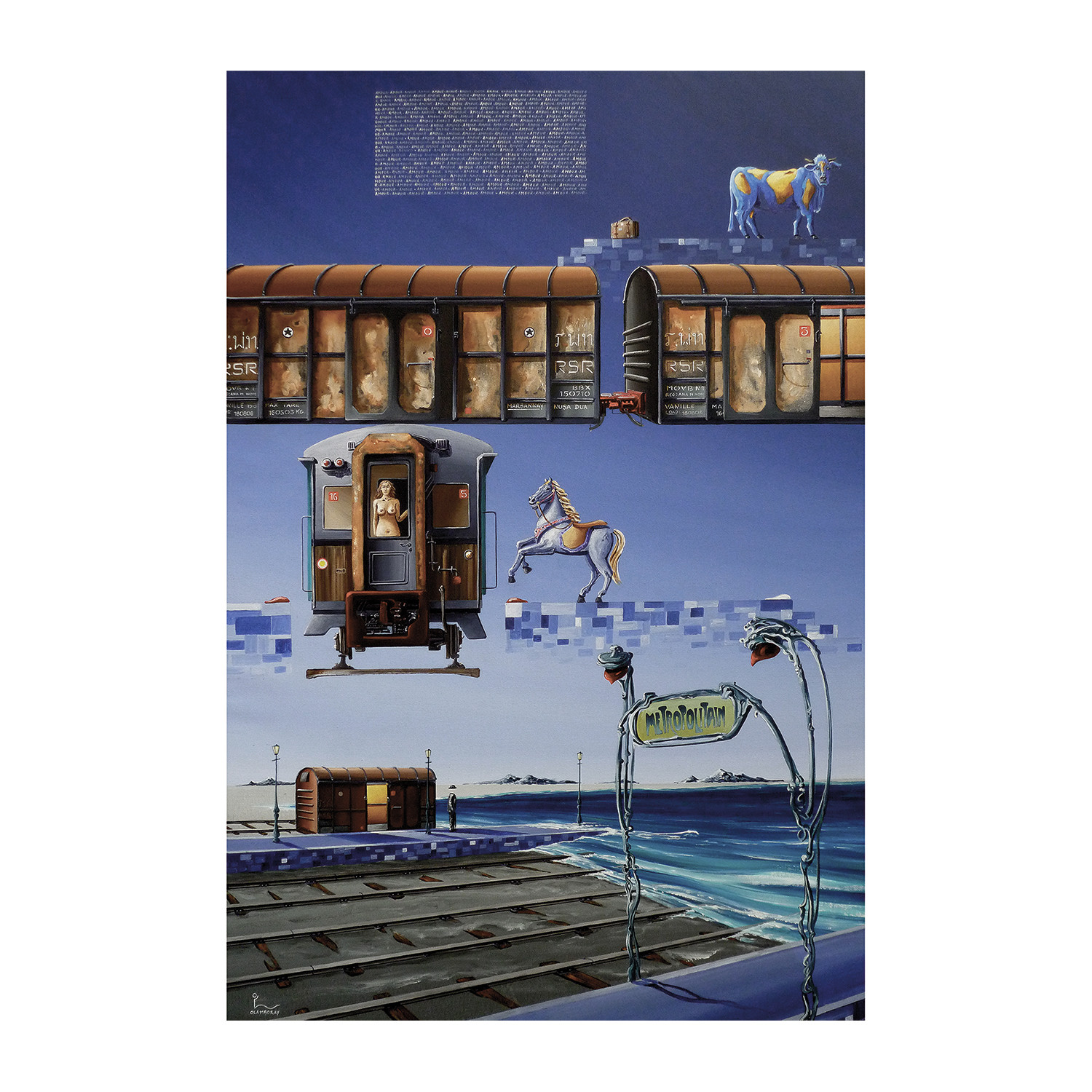The artist fuses a number of his most prized surrealist elements in The Freedom of Dreaming, with a singular blend of imagery symbolizing happiness, freedom, and the artist’s journey.