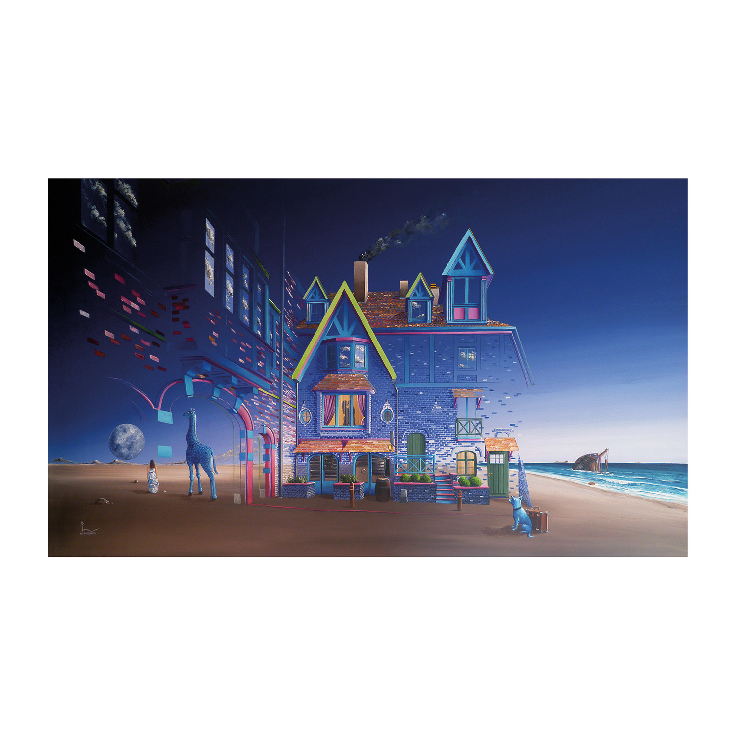 The New Ark is a commemorative piece symbolizing the beginning of the artist’s second journey into the realm of surrealist artwork. A broad spectrum of colors is used here, as the artist captures the illusion of comfortable living amidst the surreal landscape of a moon, a blue giraffe, and a sinking ship off the shore of the nearby beach.