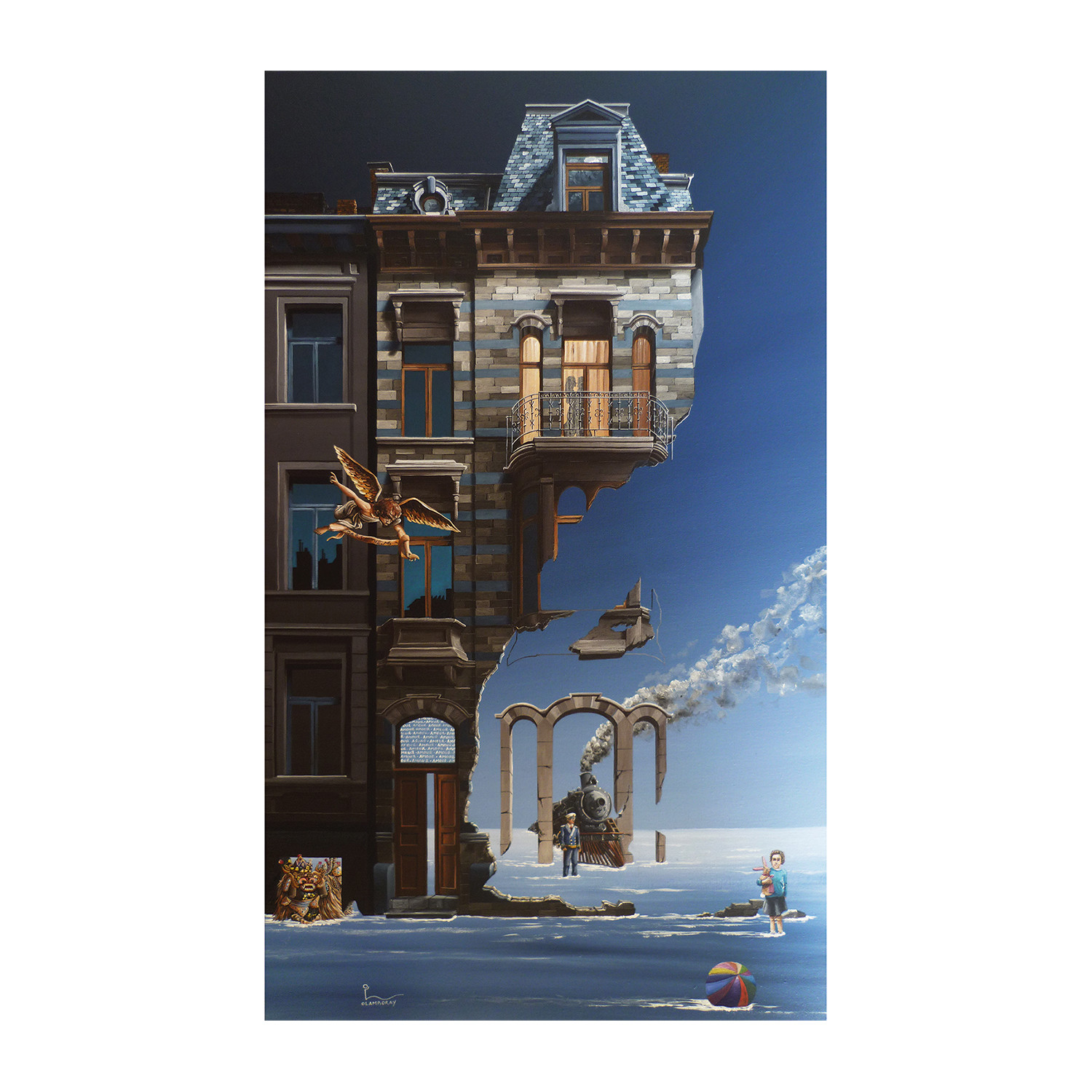 The Playing Room attempts to capture the mysticism and surreal imagery of a child’s imagination. Letting the walls crawl and the mind fully focus on play time brings forth the beauty and surrealism of innocence beneath the brick and mortar of a contemporary family home. An angel can be seen flying through the foreground clutching a scarf bearing the words “Carpe Diem."