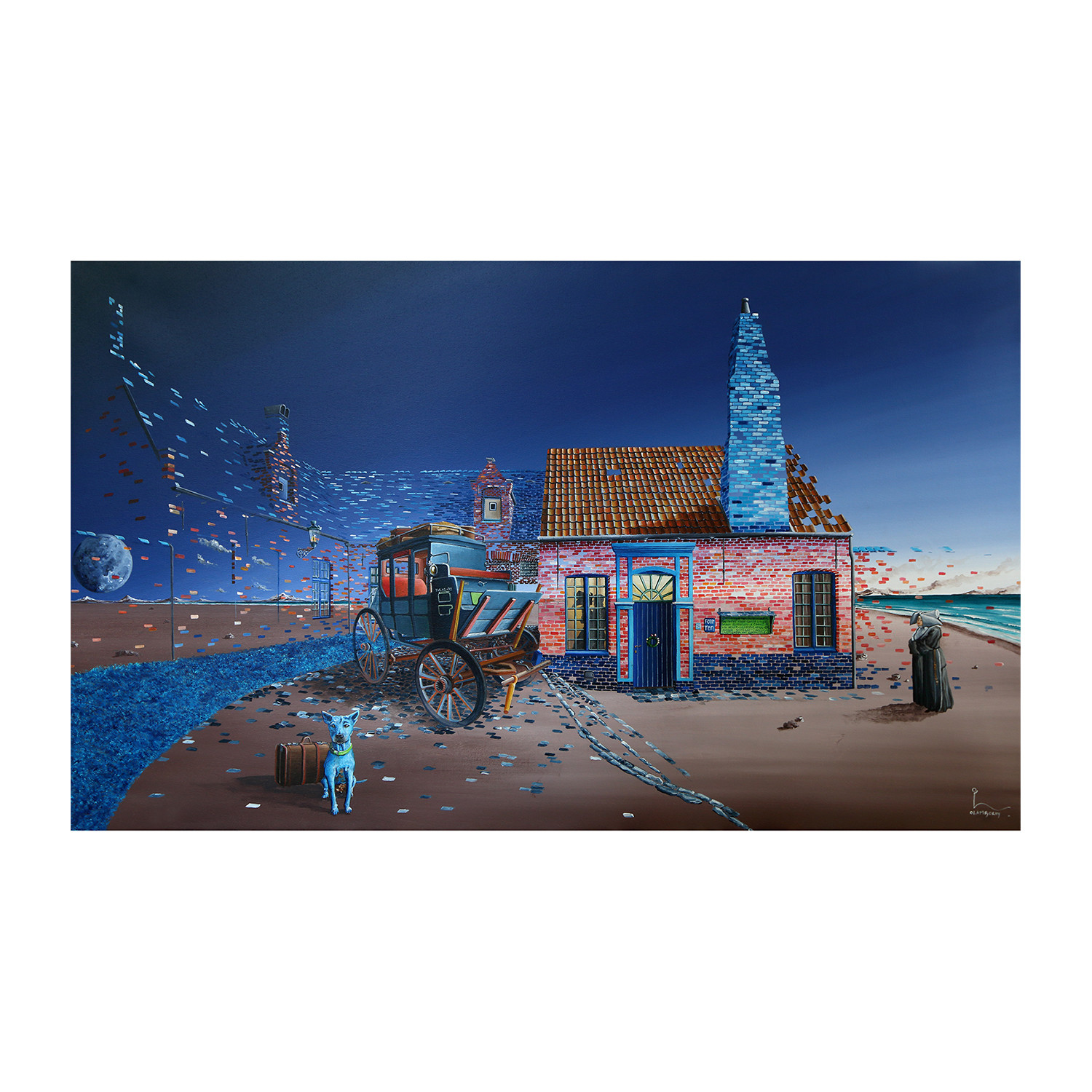 The Secret Card features small brick building staged against the night that appears quite ordinary until the foreground is illuminated by the streetlamp, revealing a traveling dog and a half-brick man making his way up the train tracks behind an old tram. Though few of the artist’s typical surrealist elements are used here, the viewer is left to imagine what secrets lie within
