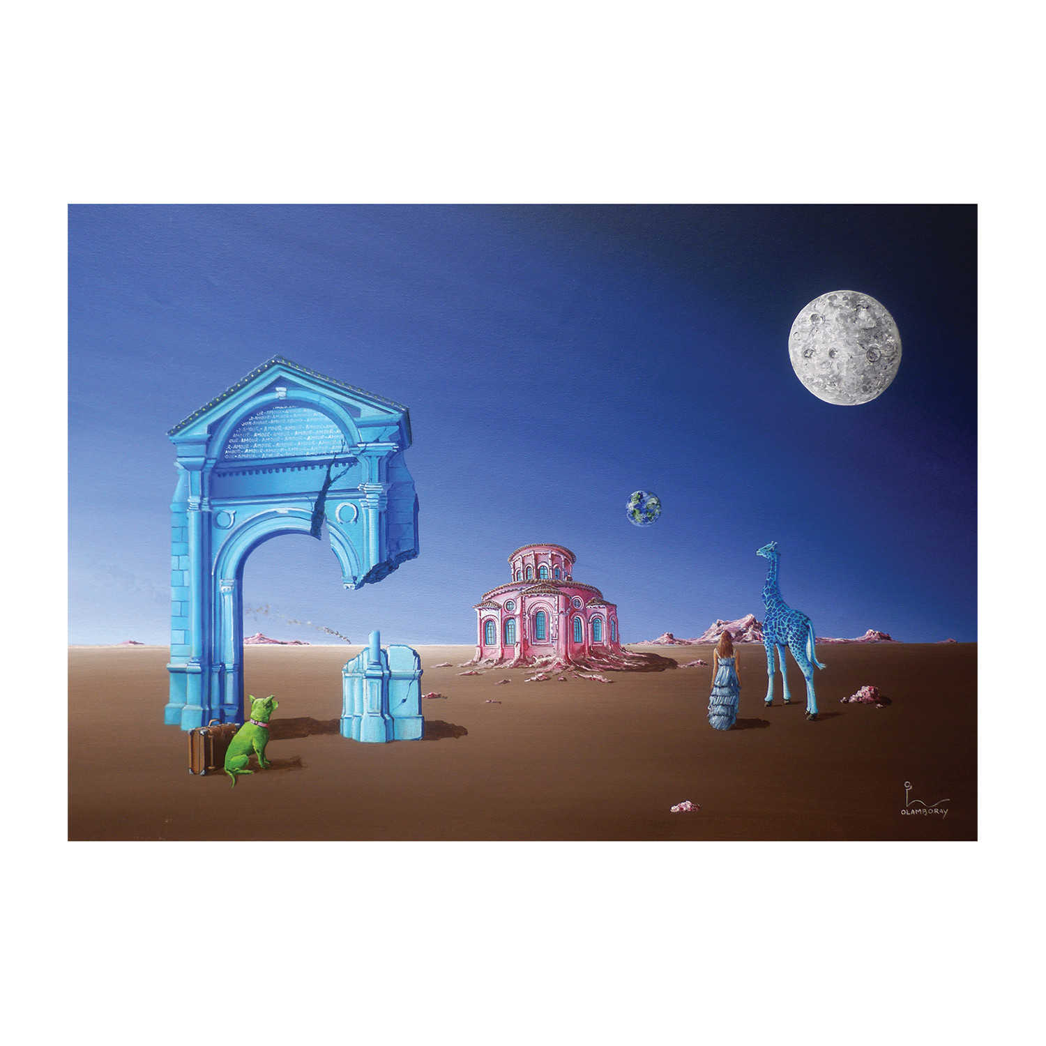 Toulouse Dawn by Olivier Lamboray depicts the decomposition of the Basilica of Saint-Sernin in Toulouse, set in a surrealist setting, in hues of blue and beige, with highlighted symbols in pink, green and white.