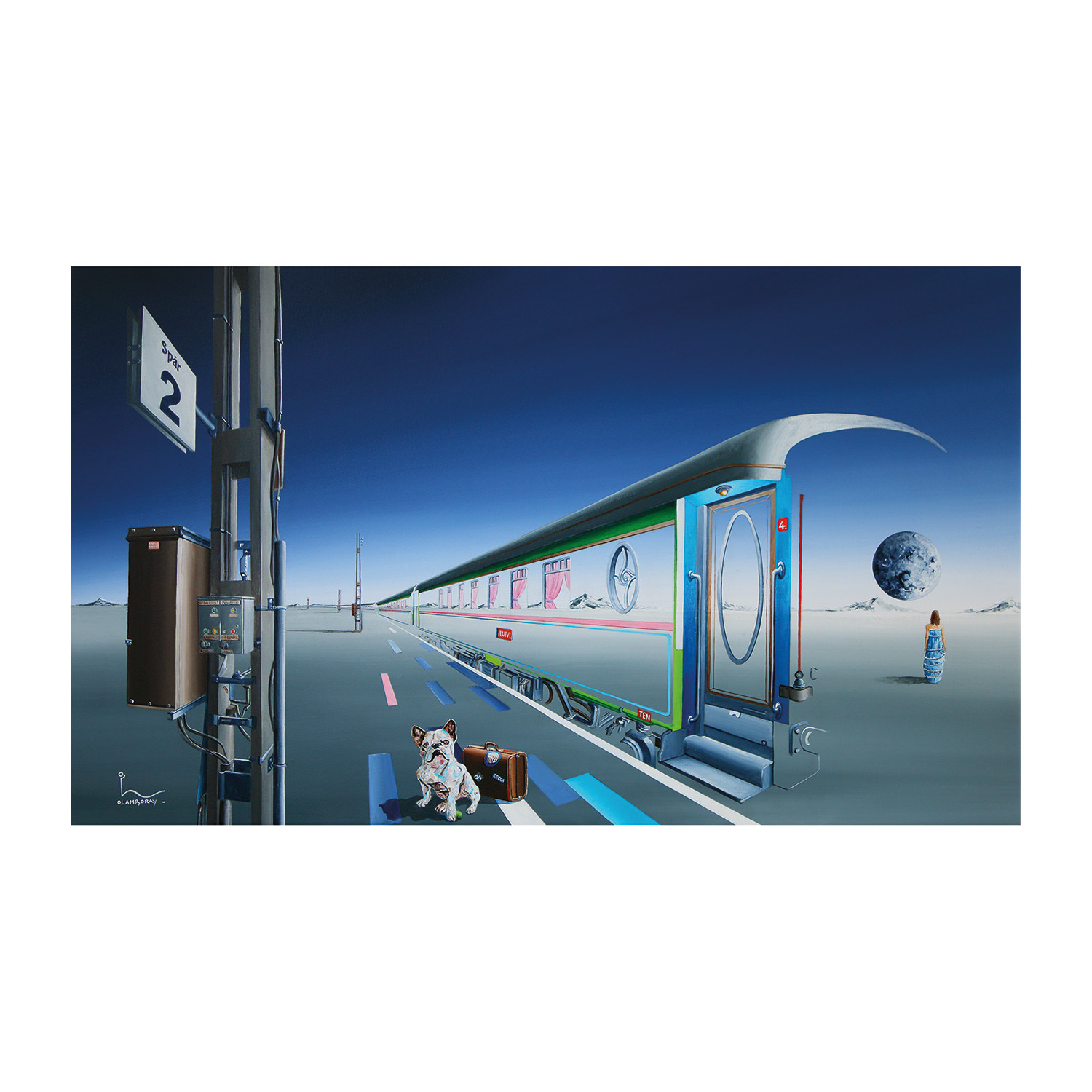 The artist’s dream is captured here by the presence of a colorful new bulldog standing ready for a journey aboard an almost invisible, seemingly endless train. Beyond the train, a beautiful woman walks slowly toward the low-hanging moon and distant mountains on the horizon. Was It Just A Magnificent Dream?