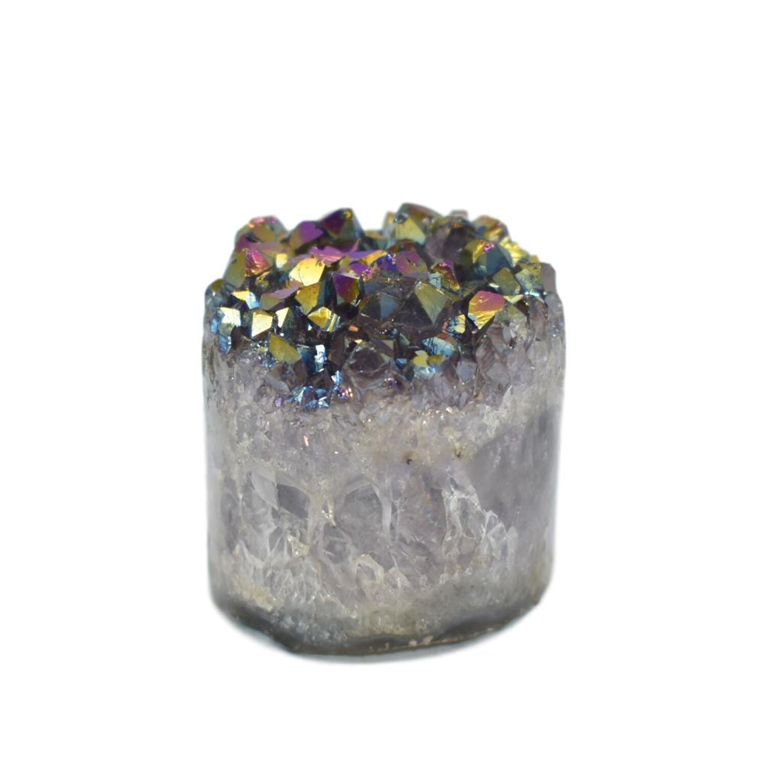 Metalized amethyst is the perfect addition to your gemstone collection. This Metalized Amethyst Cylinder specimen is small, but mighty. The eclectic yet eye-catching cylindrical design showcases the spell-binding beauty of amethyst, a soothing and energy clearing stone. With a vibrant luster created from a coating of metal, this piece truly shines.