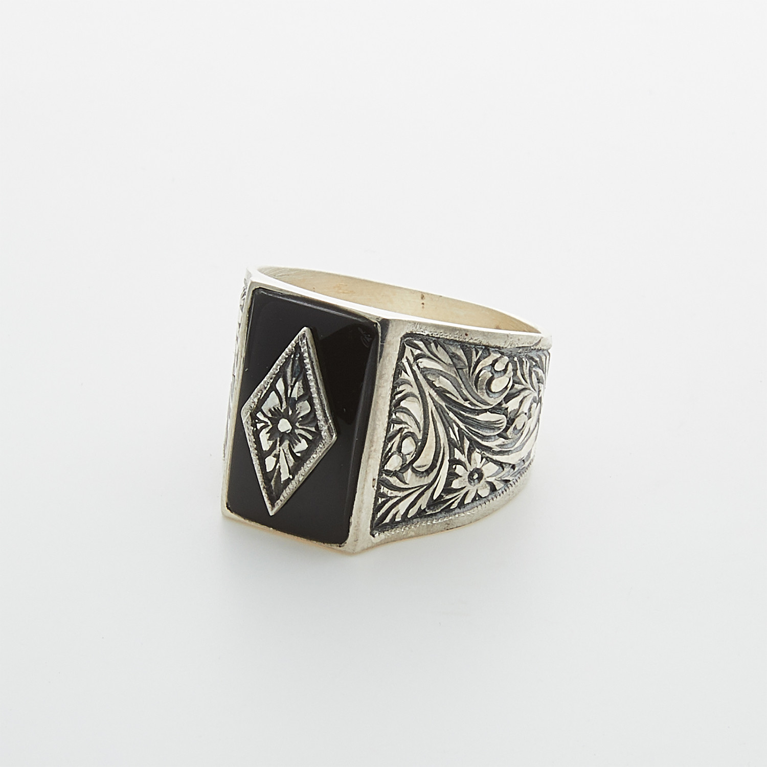 Exuding a strong sense of refinement and confidence, this bold statement ring by Onthologie features an intricate, timeless design inspired by historical artistic styles and geometric motifs. Each piece has been individually hand carved by expert artisans from genuine sterling silver, resulting in a brilliant finish that enhances any casual or formal look.