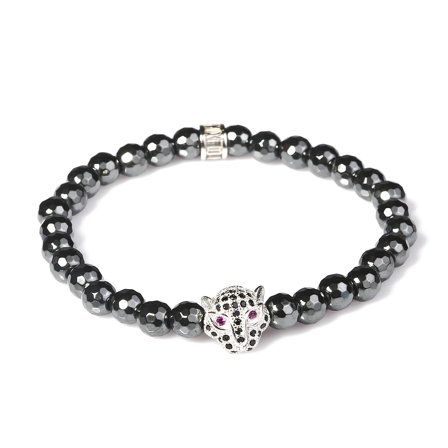 6mm hematite stone,6mm silver loop,Silver cat charm