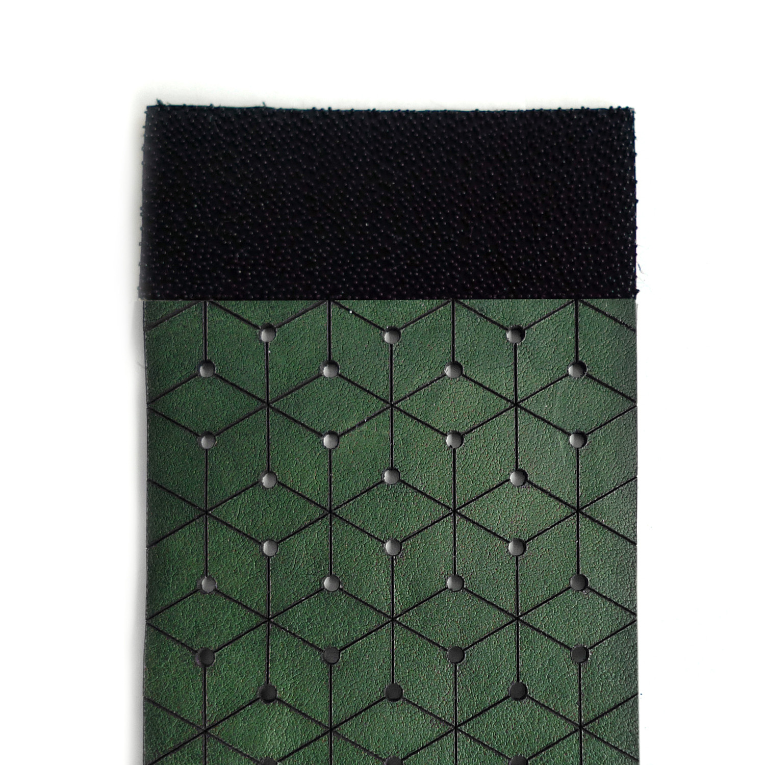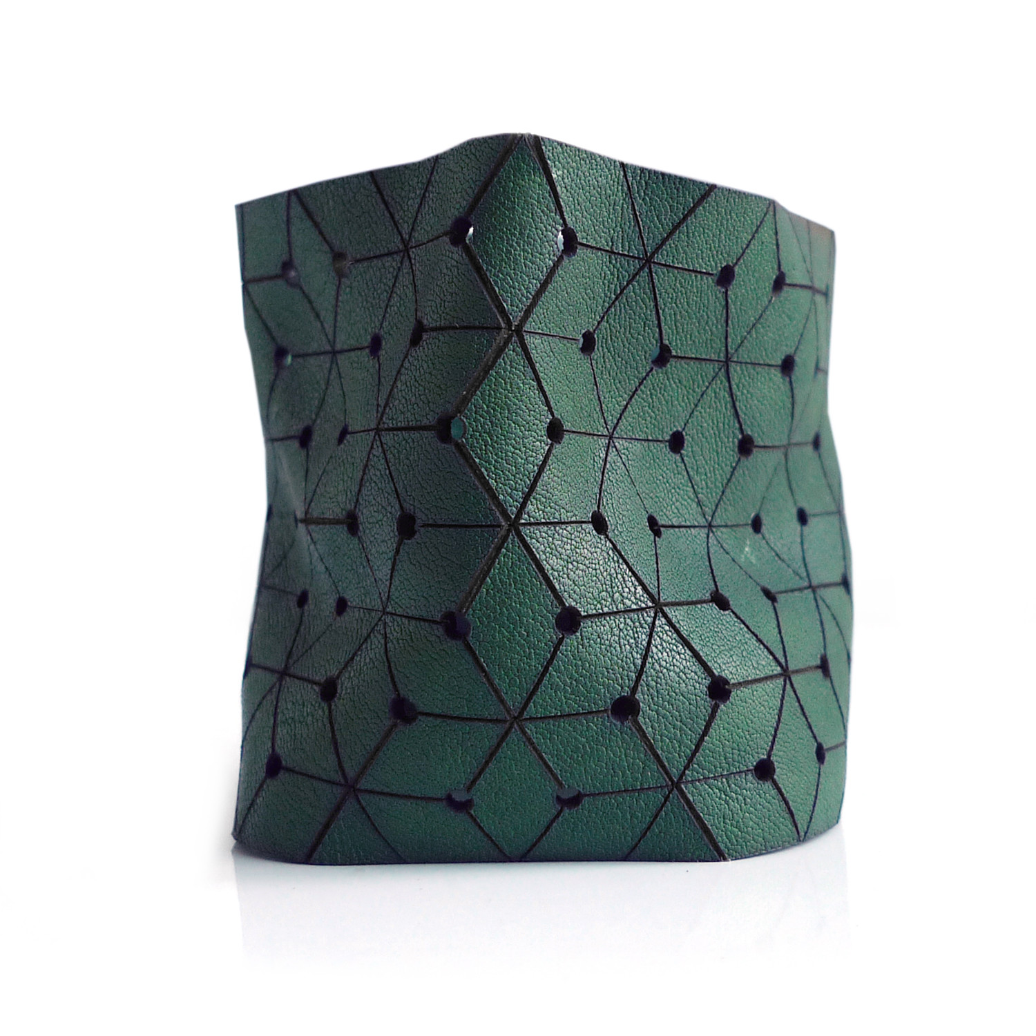 This handsome geometric cuff is a bold addition to any outfit. The nature of the etched leather causes this cuff to move and bend as you do; it's a unique piece that's sure to garner attention.