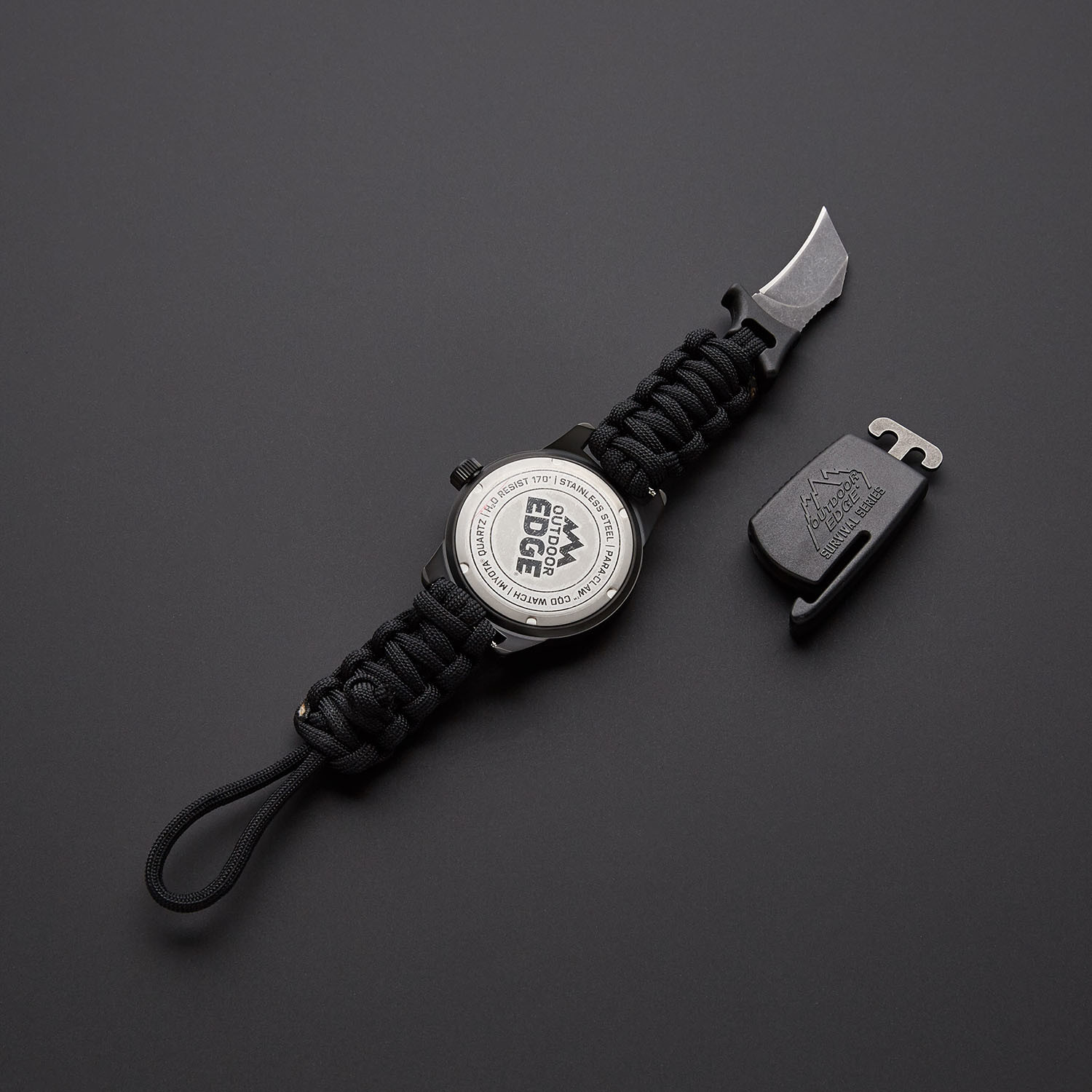 The precisely crafted Paraclaw CQD Watch features a reliable Japanese quartz movement in a rugged stainless steel body that is water resistant to 170ft. It features a paracord wristband with a patented Para Claw buckle that houses a razor sharp 1.5" stainless steel hawkbill blade that can be carried discretely and can be drawn quickly and easily. It's a serious piece of everyday carry for outdoor enthusiasts and gadget lovers alike.