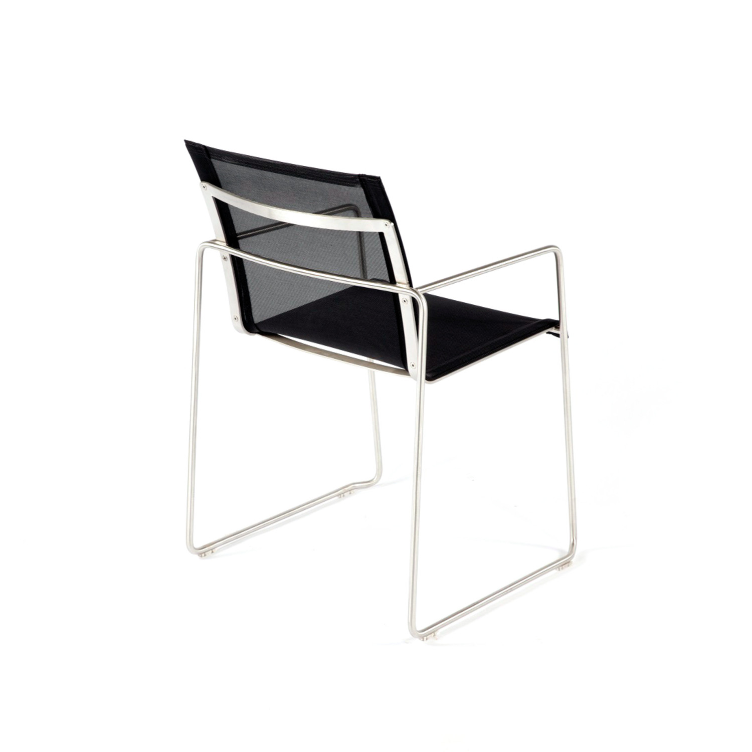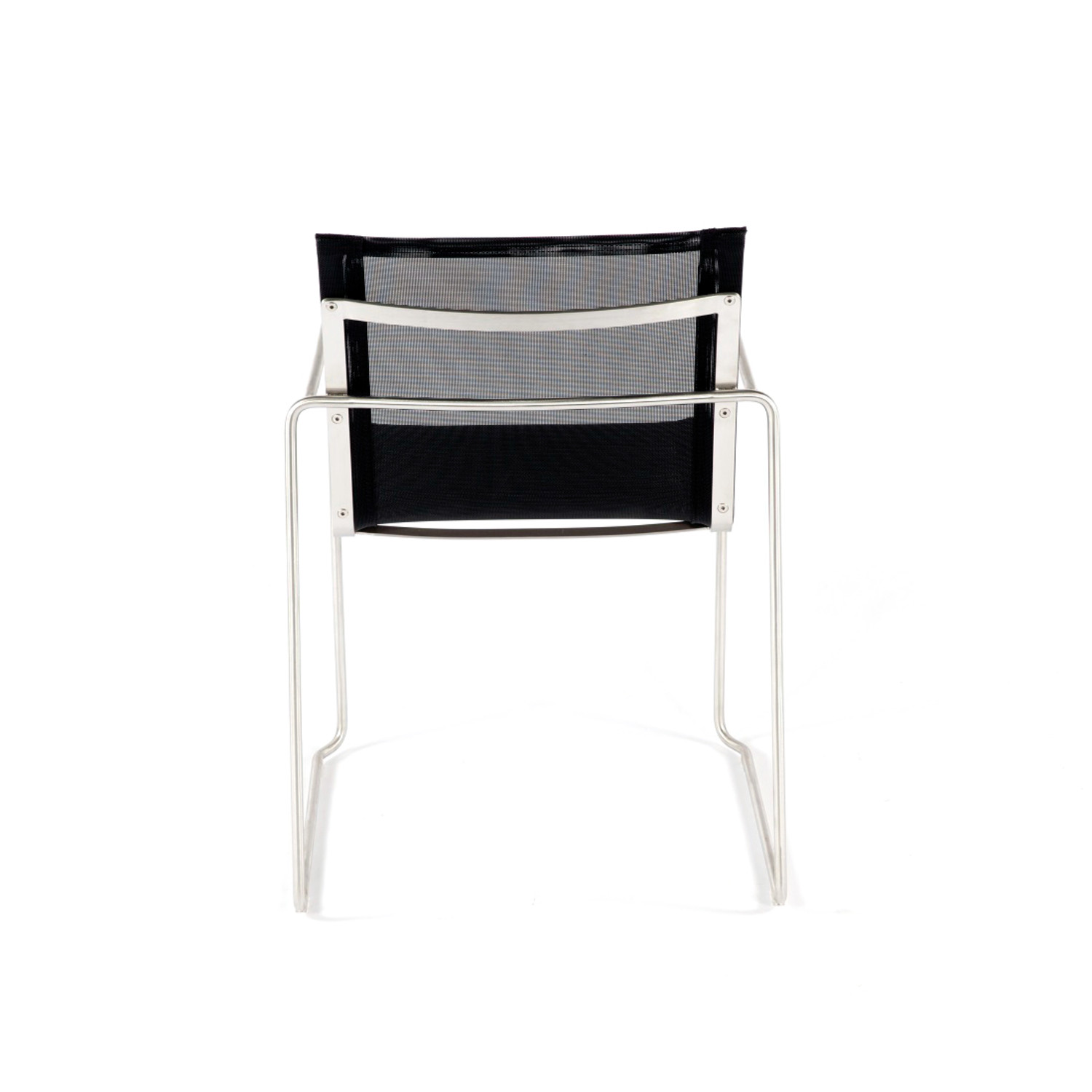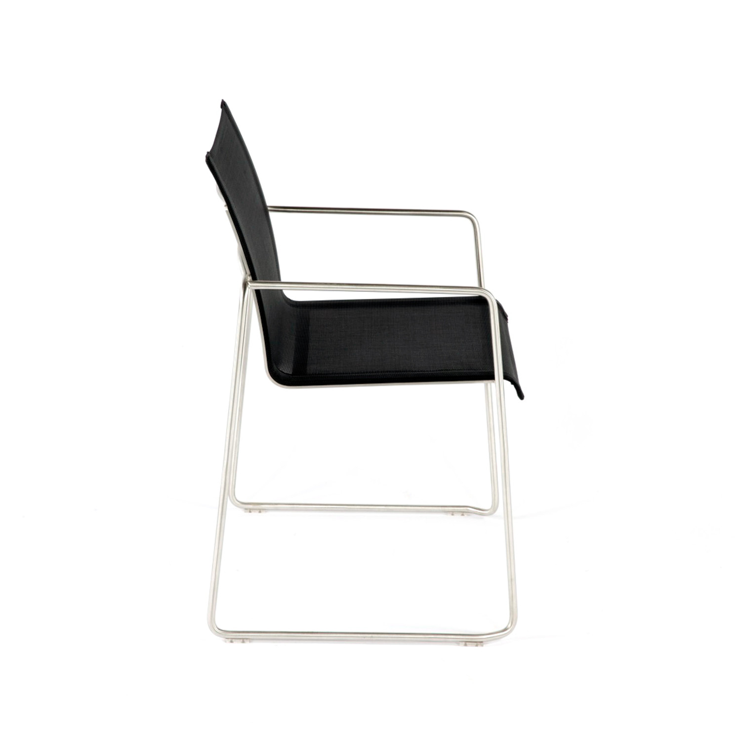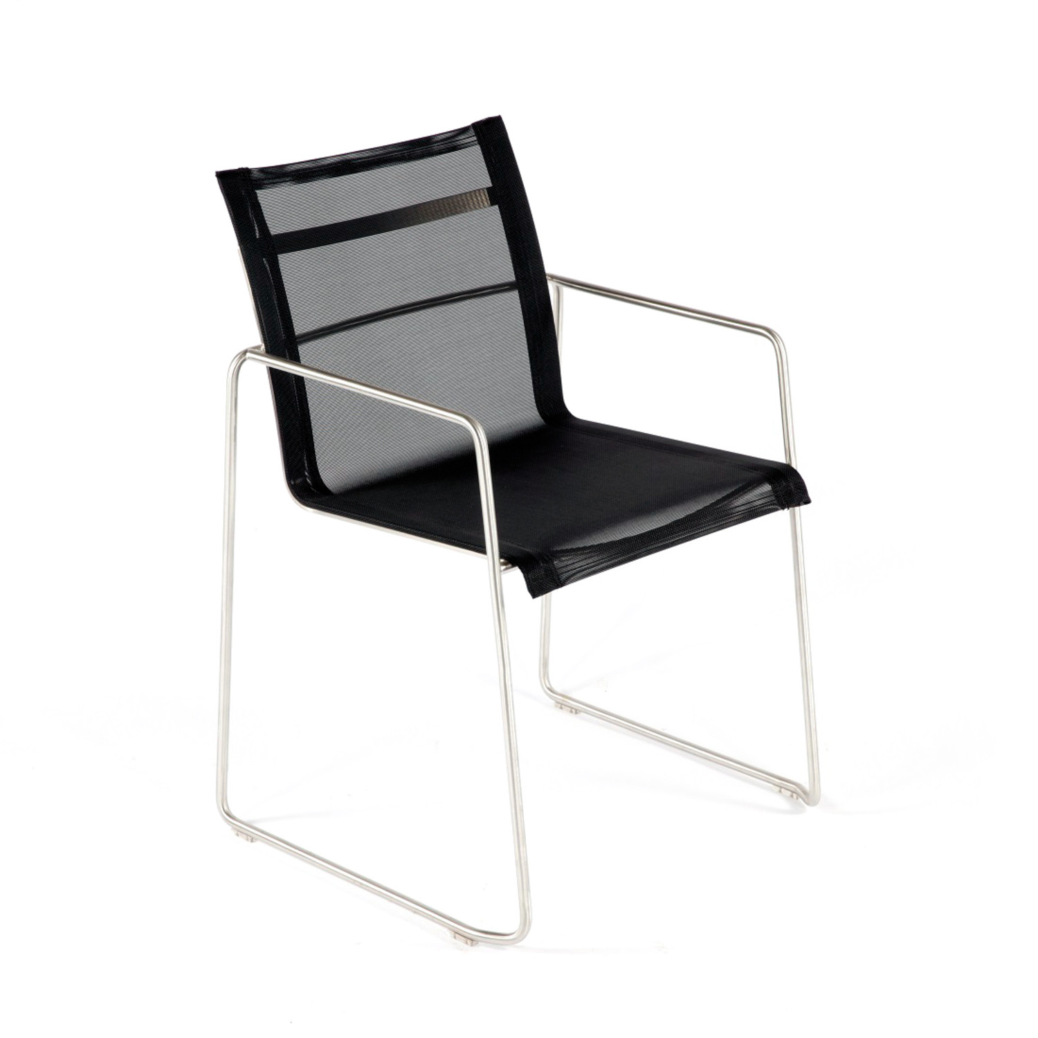 The frame of the Dynamic Arm Chair is crafted from stainless steel with a chrome finish. The seat and back are a composite sling outdoor fabric that flexes ever so slightly so as to increase comfort. This contemporary furniture piece is suitable for indoor and outdoor use.