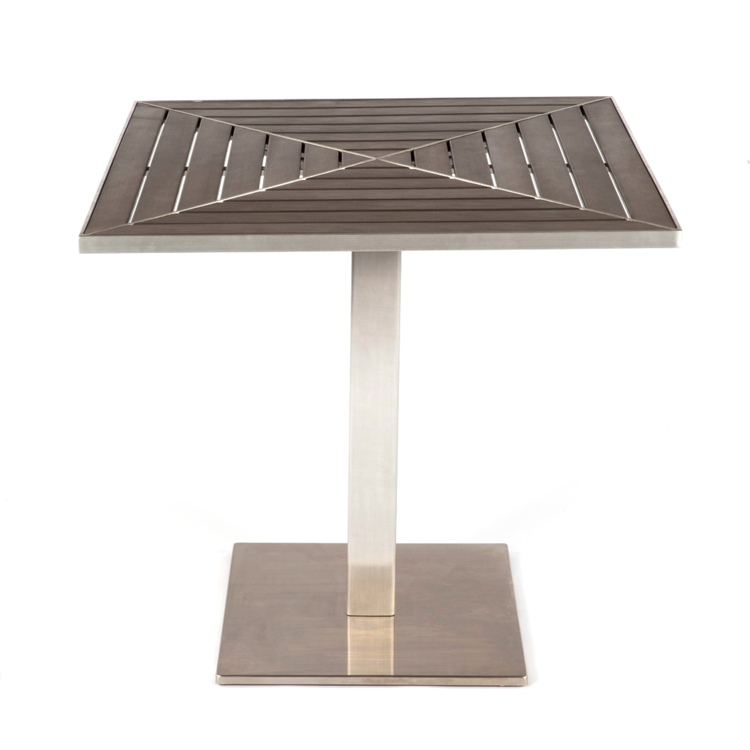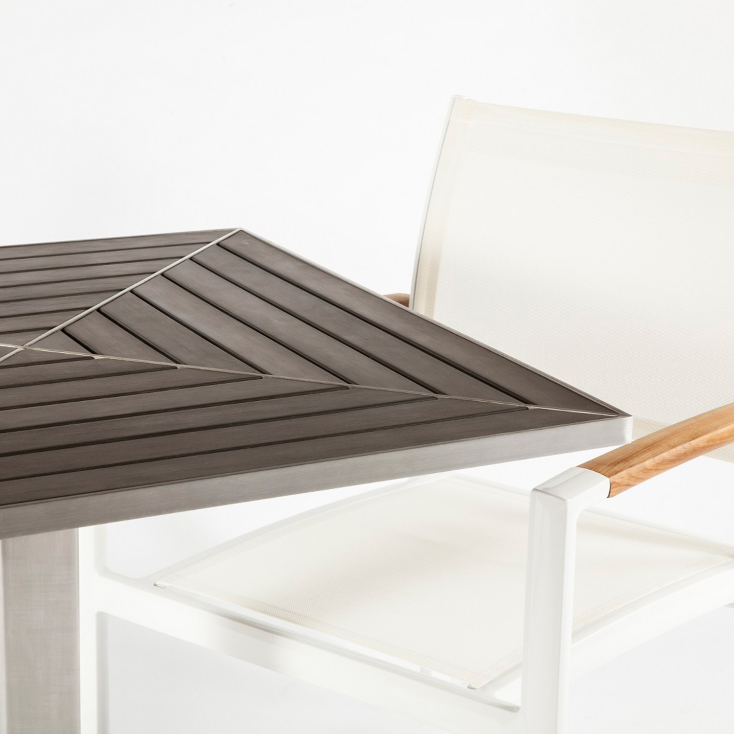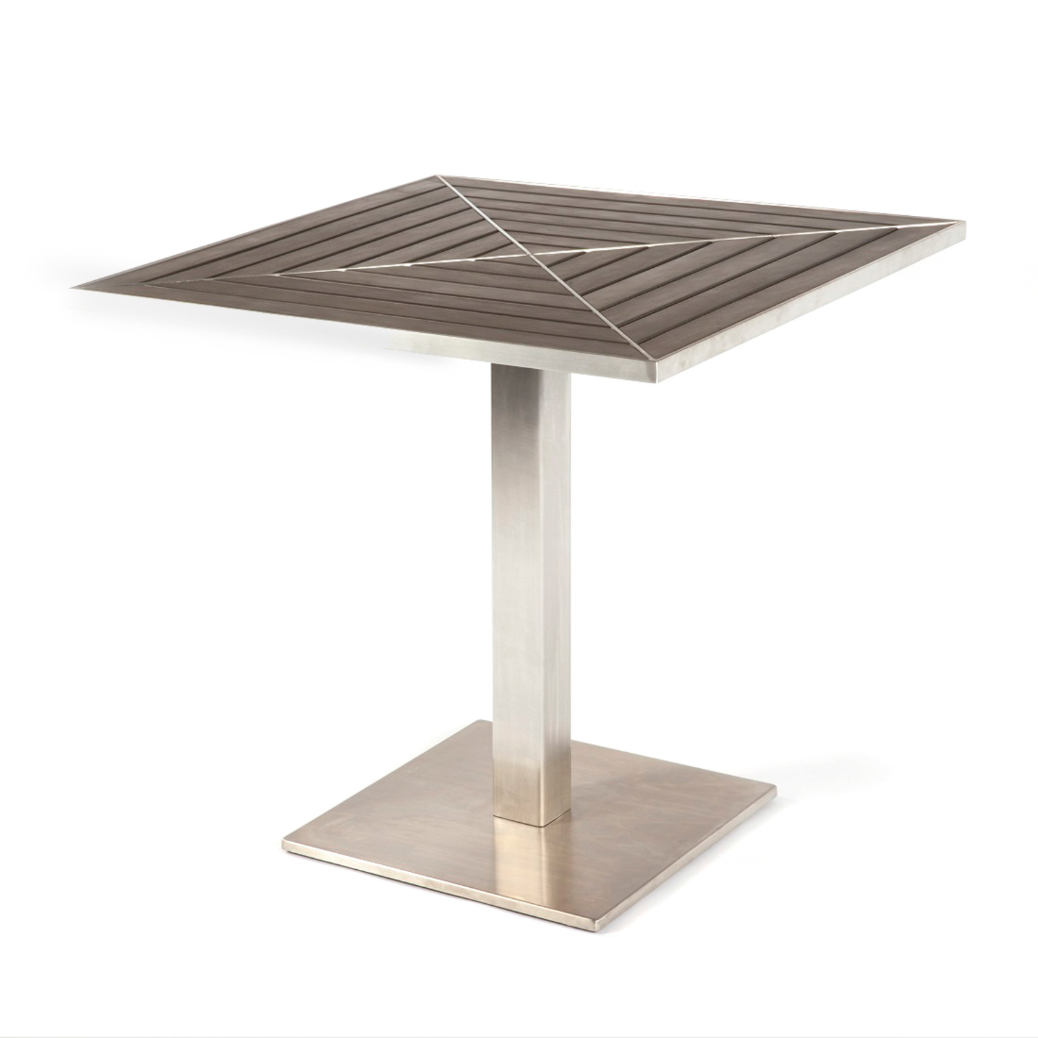 A synthetic wood top is supported by a matching square aluminum pedestal base in a powder coated grey finish. This is the Oslo Dining Table. The table top is divided diagonally and then the four triangles are inset with open gap "wood" slats.