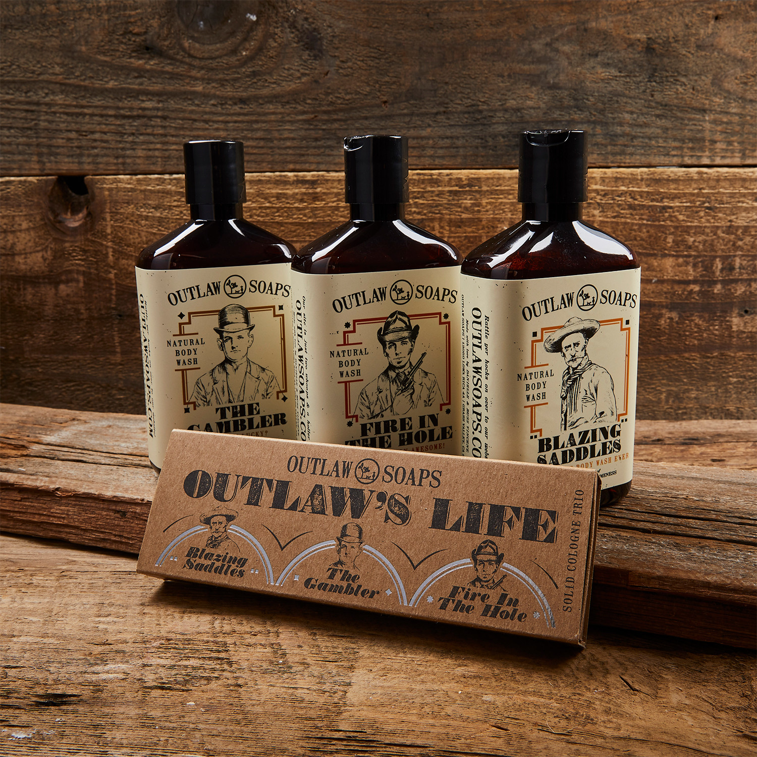 Capturing the essence of rambling cowboys, fearless adventurers, and the invigorating smell of the great outdoors; the Cologne + Body Wash Trio by Outlaw Soaps is designed to give you an enticing, ruggedly masculine scent that lasts all day long. With 3 travel-ready, solid colognes and 3 natural body washes, this set is designed to evoke the spirit of the Wild West while leaving your skin clean, silky soft, and smelling incredible.