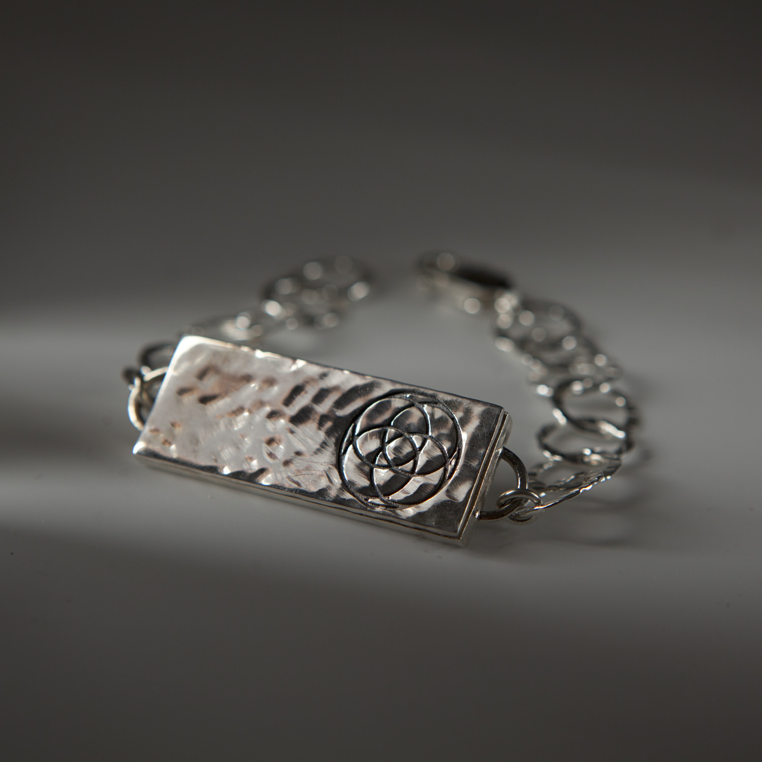 This bracelet has a sense of purpose that can only be fulfilled in union with the beautiful soul of its owner. The simple shapes in Hydraulis conveys the idea that symmetry creates harmony. While pleasing to the eye, each element within the pieces has a more powerful goal. Its fragrant and effortless nature celebrates hammered sterling silver.