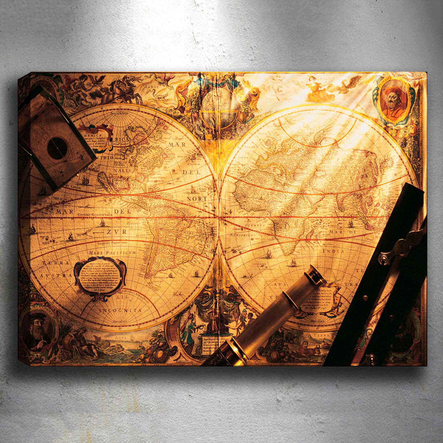 Printed on hand-stretched, specially prepared canvas, this collection of vintage maps features everything from the scattering of ancient civilizations, to artistic images that include parchment scrolls and old mariner's compasses.