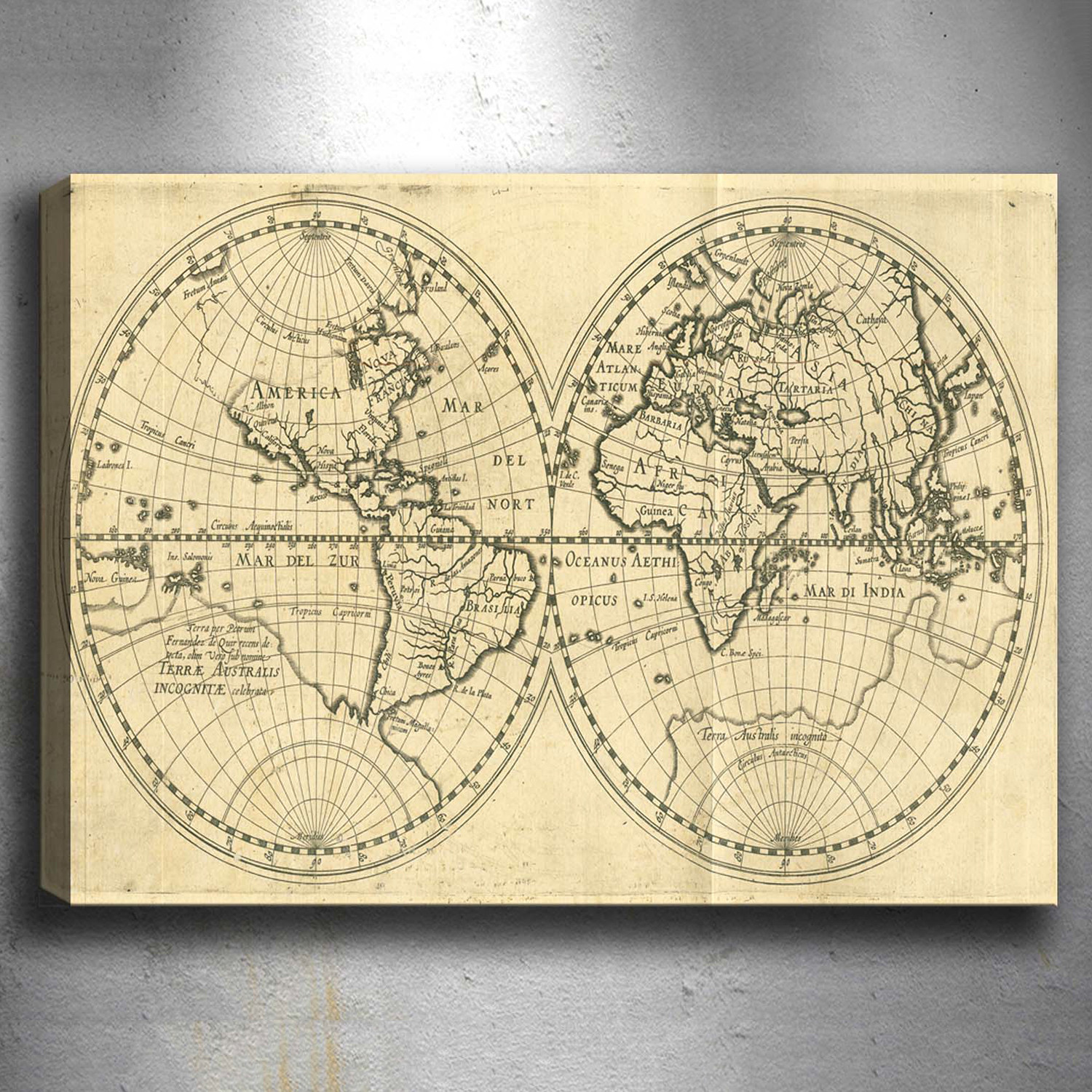 Printed on hand-stretched, specially prepared canvas, this collection of vintage maps features everything from the scattering of ancient civilizations, to artistic images that include parchment scrolls and old mariner's compasses.