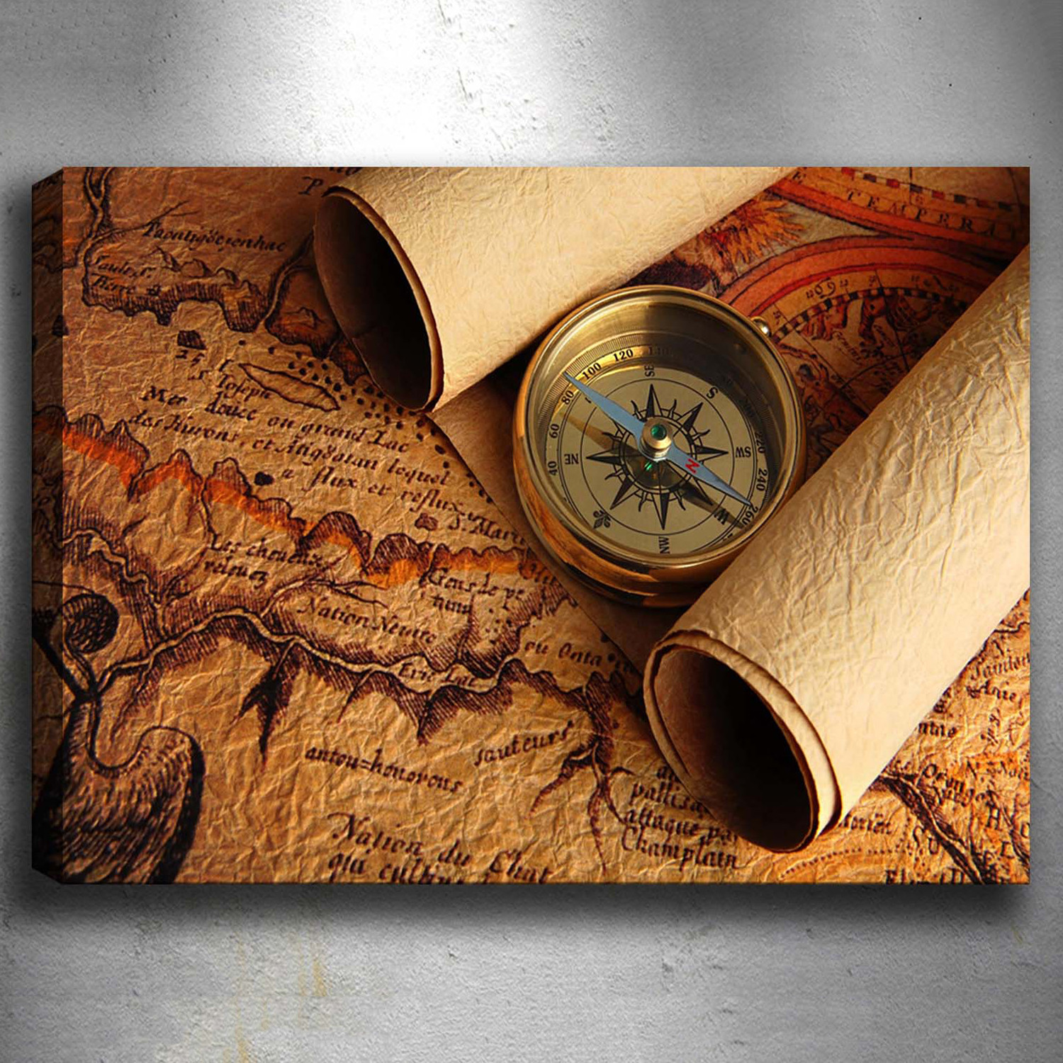 Printed on hand-stretched, specially prepared canvas, this collection of vintage maps features everything from the scattering of ancient civilizations, to artistic images that include parchment scrolls and old mariner's compasses.