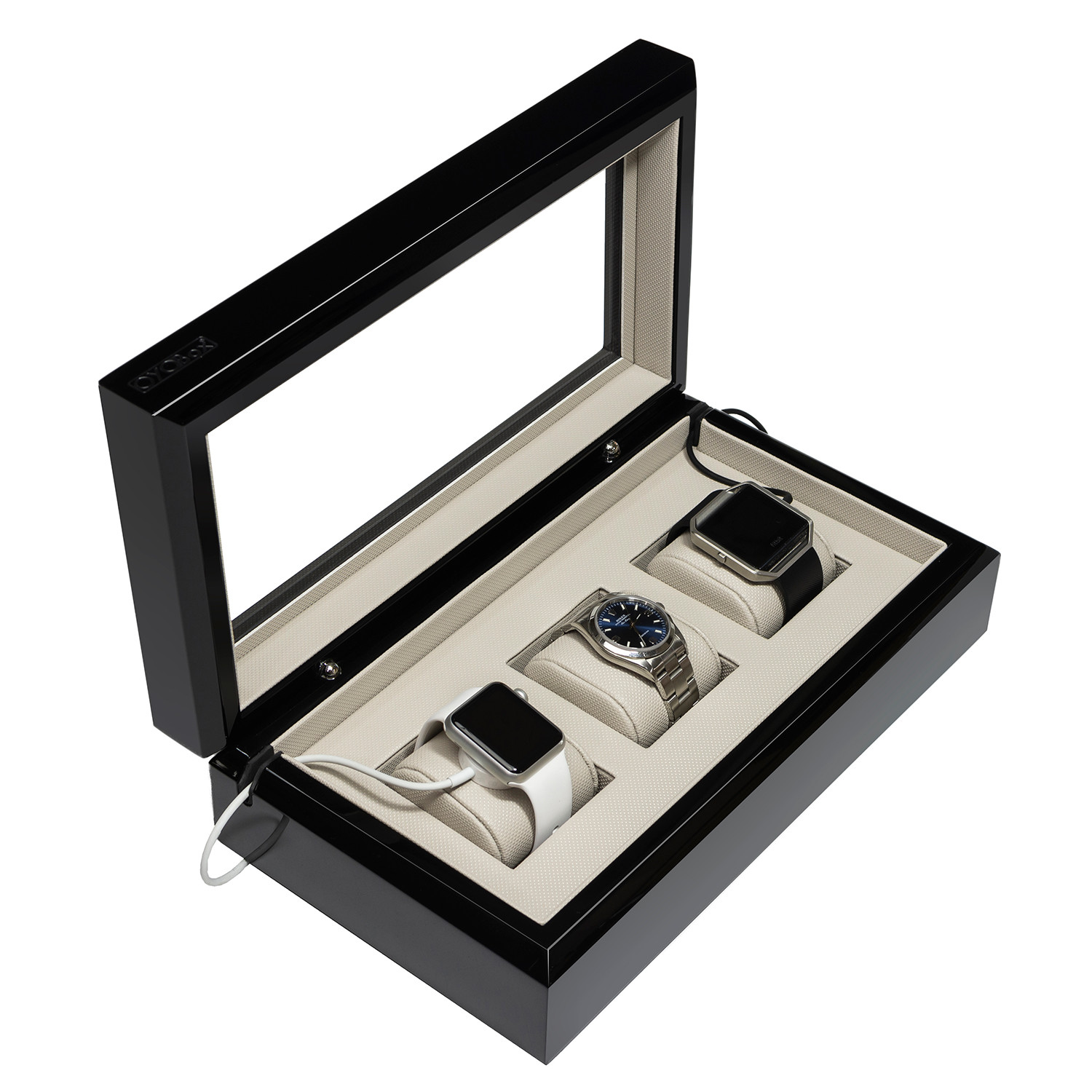 The OYOBox Smart Watch Box is handcrafted with seven layers of lacquer out of durable wood, with a washable leatherette interior. It fits up to 3 of your watches on soft pillows, with a shatterproof top window to put them on full display.